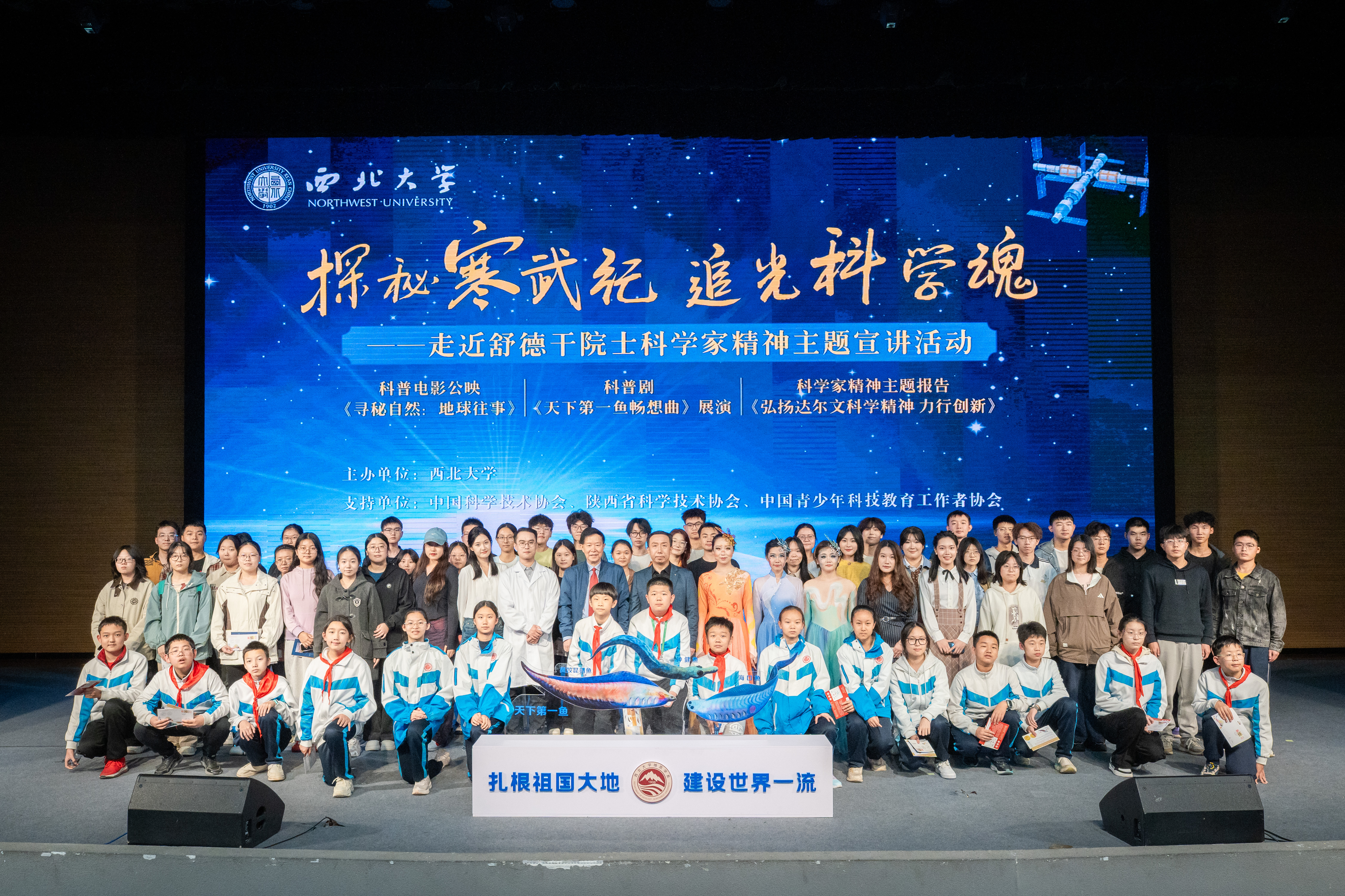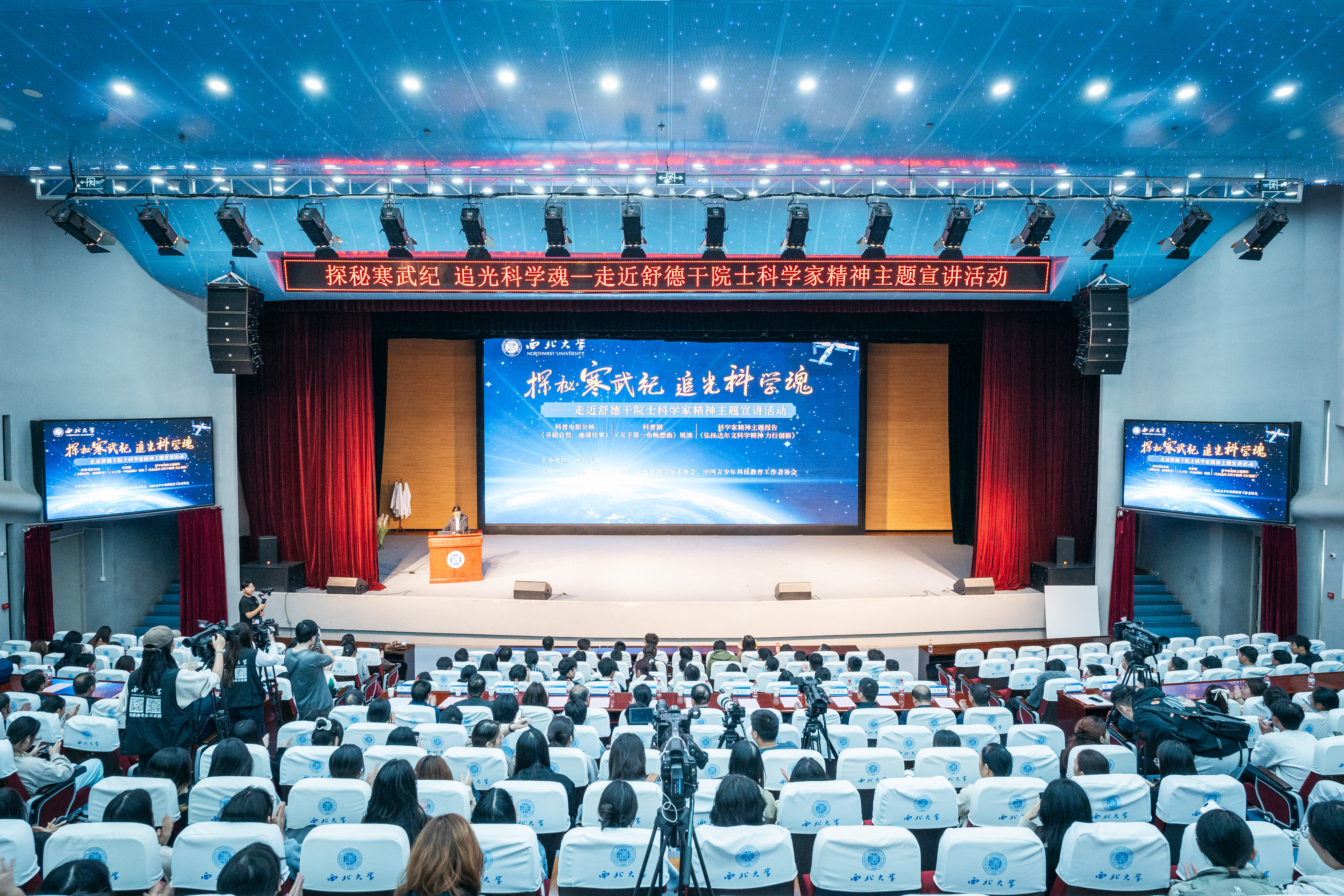 10月15日晚,正值我校123岁校庆日,长安校区大学生活动中心灯火通明,一场以“探秘寒武纪·追光科学魂”为主题的科学家精神宣讲活动在这里举行。活动通过科普电影公映、原创科普剧展演和科学家精神报告等多种形式,带领现场师生走近中国科学院院士、我校地质学系教授舒德干的科学探索历程,沉浸式感受科学家精神的深邃力量。活动受到中国科学技术协会、陕西省科学技术协会、中国青少年科技教育工作者协会的支持。校党委副书记张清,校党委常委、副校长张远军出席活动,学校相关单位负责人,地质学系、文学院、博物馆、附属中学等500余名师生共同参与。张远军、我校地质学系教授华洪主持仪式及学术活动。