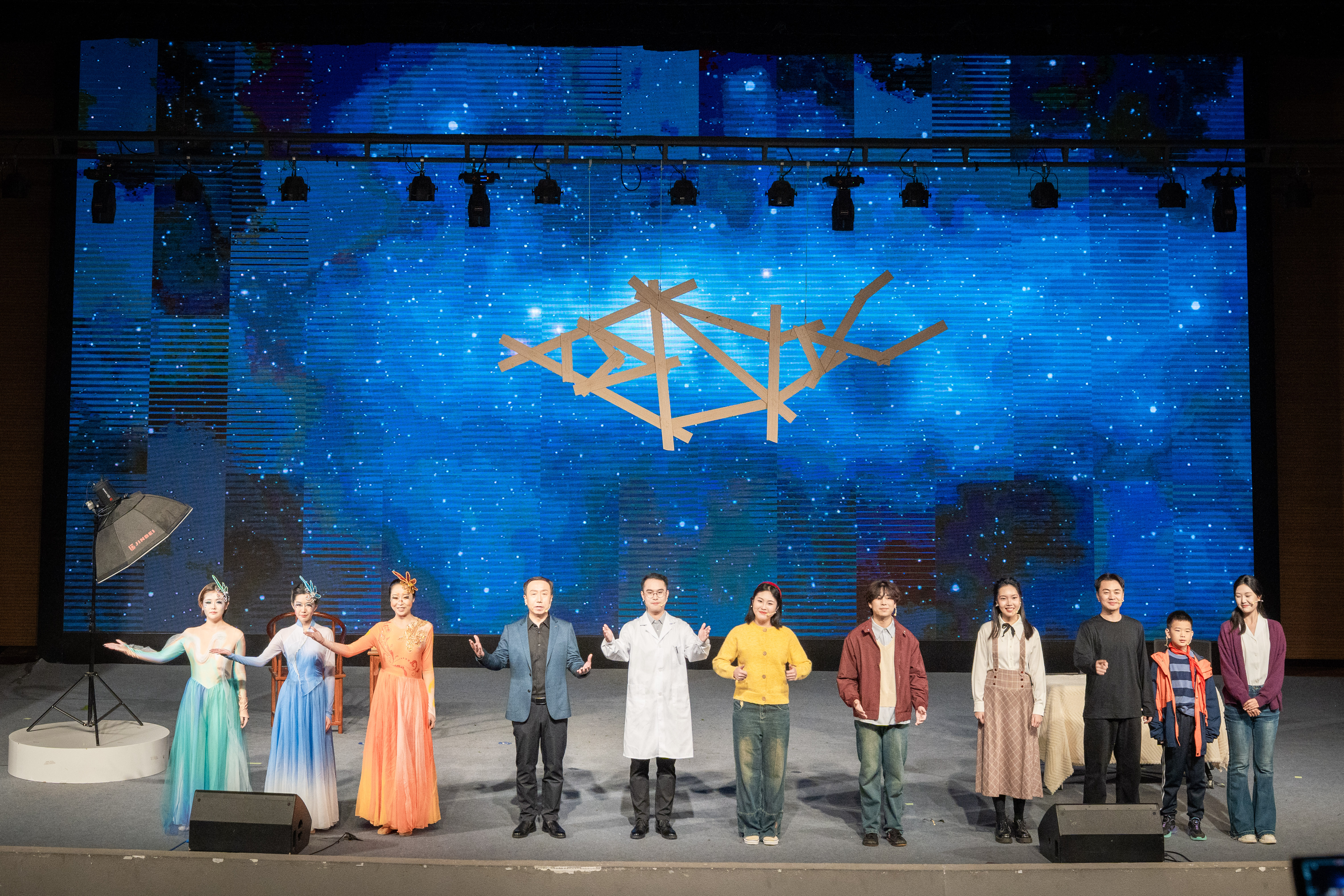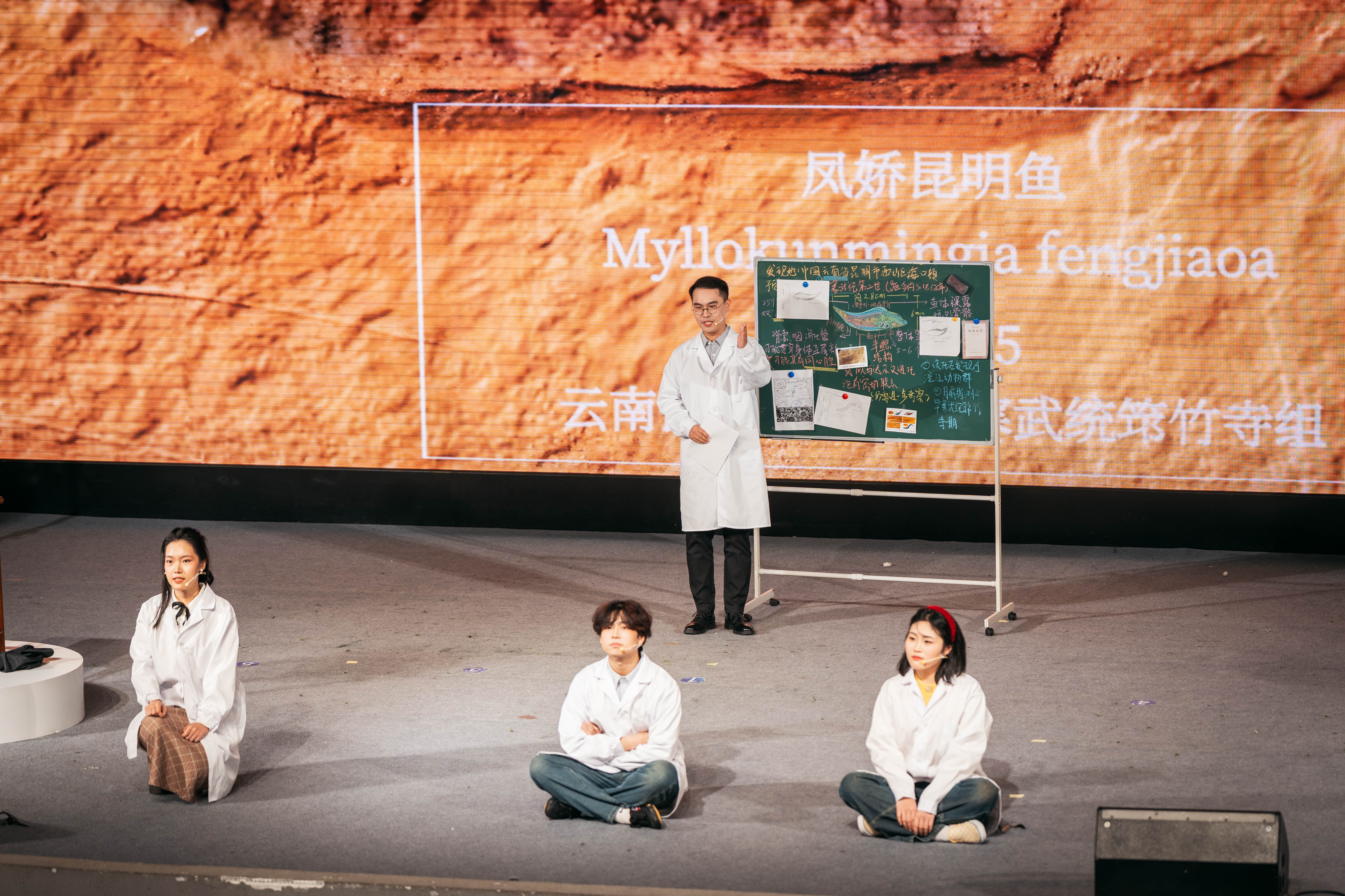 由我校文学院与地质学系联合出品、文学院师生倾情排演的原创科普剧《天下第一鱼畅想曲》,以戏剧艺术的形式,将科学故事搬上舞台,实现了“硬核”科研与“浪漫”人文的碰撞。该剧以舒德干院士及其团队发现已知最早的脊椎动物化石——“凤姣昆明鱼”的故事为原型,通过戏剧化叙事和象征性舞台表现,再现科学家“探秘寒武纪”的科研旅程。剧中,少年舒德干对鱼类世界充满好奇,在母亲“凤姣”的鼓励下踏上了科学探索之路。时光交错间,舞台切换至1999年的实验室。舒德干与三位学生围绕一块来自云南的化石展开研究,通过对肌节、鳃囊、心脏、脊索等结构的严谨分析,确认这是一条寒武纪鱼类化石——后命名为“凤姣昆明鱼”。“凤姣”,正是舒德干母亲的名字——他用此命名表达“母亲孕育生命、科学孕育真理”的寓意。舞台上,演员们用富有诗意的对白诠释科研的严谨,展现了科学家从少年好奇到终身探索的精神蜕变。“舒院士用自己母亲的名字为昆明鱼命名,将‘母亲’的生物学意义与情感意义交融,所蕴含的诗意与情怀让我印象深刻。”西大附中八年级二班学生经悦然说。据了解,该剧目前已获得2025年科学家故事舞台剧推广行动剧目培育专项资助。为打造这部科普剧,创作团队多次走访地质学系实验室,邀请专家学者讲解专业知识,前后多次修改剧本10余稿,力求在科学性与艺术性之间找到最佳平衡。