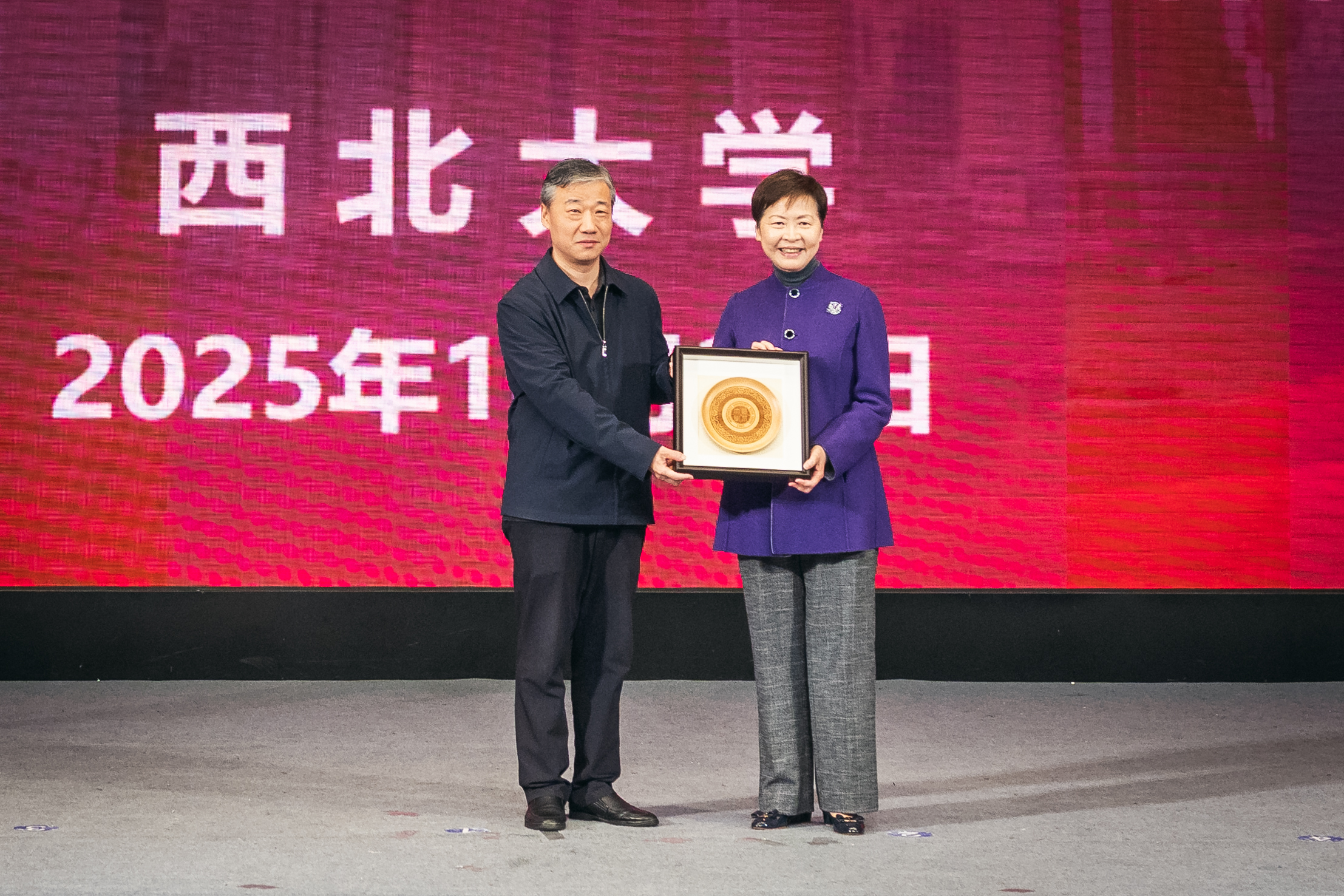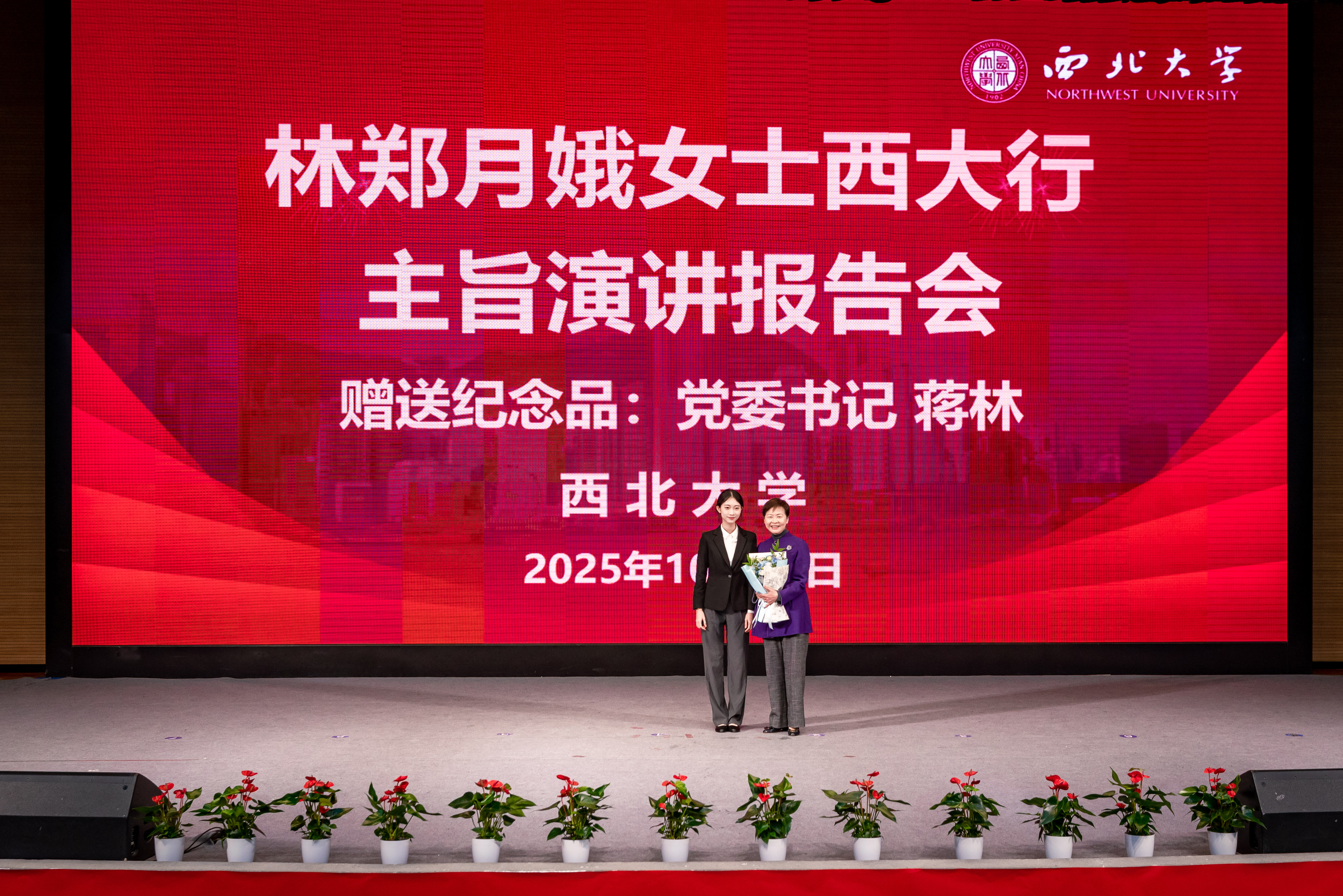 报告会尾声,蒋林代表学校向林郑月娥女士赠送了纪念品,香港籍学生代表献上鲜花,向她致以崇高敬意和诚挚感谢。