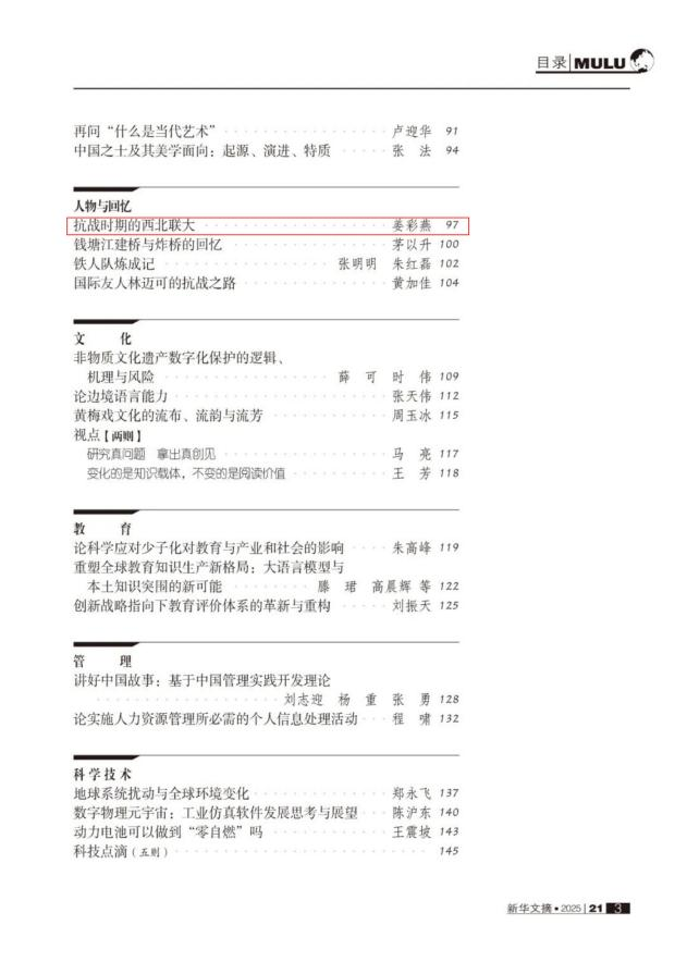 近日,文学院姜彩燕教授的文章《抗战时期的西北联大》(原载于《光明日报》2025年8月8日)被《新华文摘》2025年第21期作为封面文章全文转载。