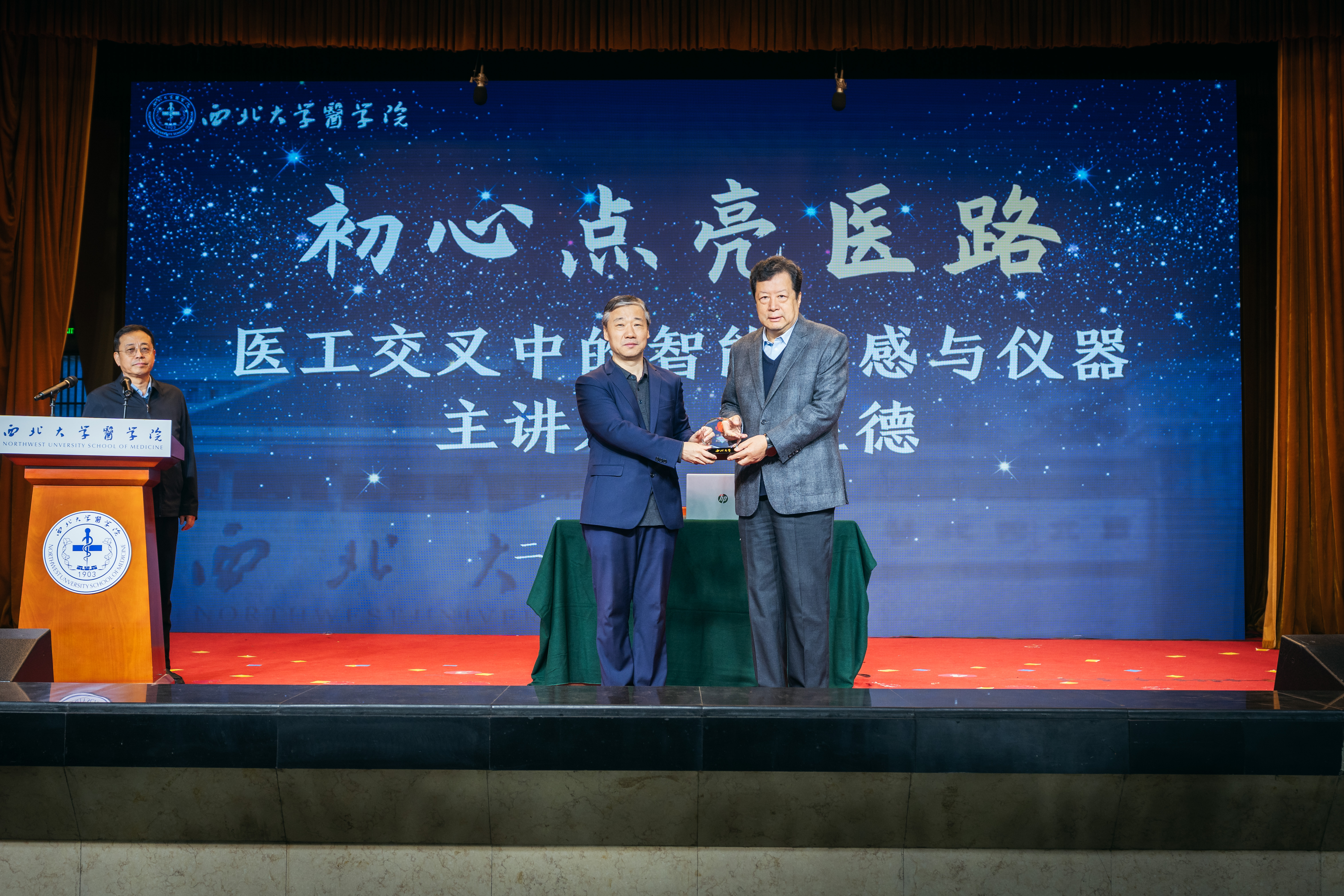 随后,中国工程院院士蒋庄德以“医工交叉中的智能传感与仪器”为题,主讲了医学新生第一场报告。他以丰富的事例,系统地回顾了生物医学与工程技术融合发展的历史,重点介绍了智能传感仪器在医学领域的应用和研究进展,并结合具体案例,生动展示了团队在该方向的创新成果。蒋庄德希望同学们在大学学习中要充分利用综合大学的资源,注重医工、医理、医文交叉,关注新技术,培养科学思维,促进医学技能提升。蒋林向蒋庄德院士赠送“杨钟健学术讲座”纪念牌。
