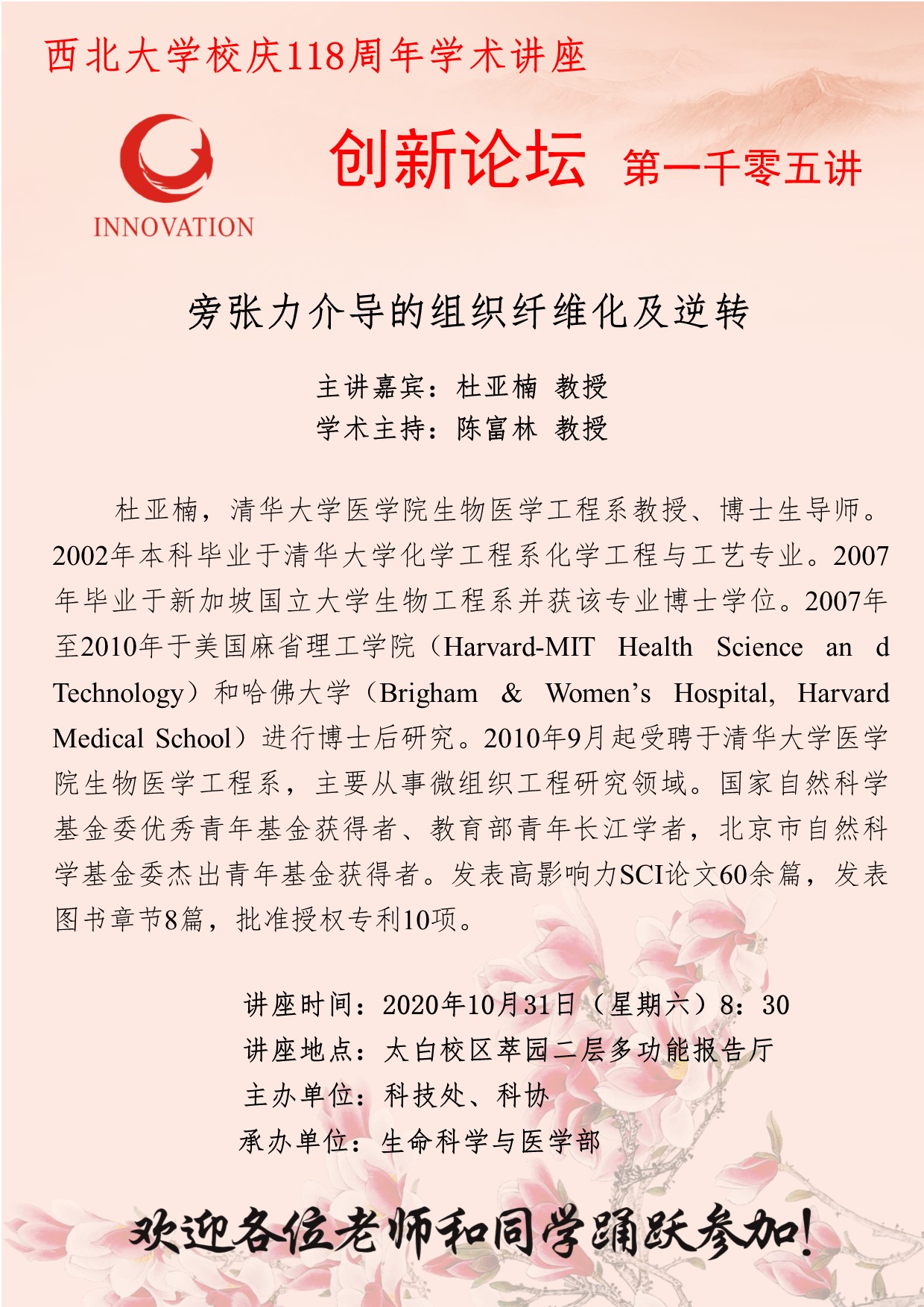 杜亚楠 教授 乐动网页版登录入口创新论坛第一千零五讲暨校庆118周年学术讲座:旁张力介导的组织纤维化及逆转 讲座时间 2020年10月31日(星期六)8:30 讲座地点 太白校区萃园二层多功能报告厅 讲座人介绍 杜亚楠 教授 讲座内容
