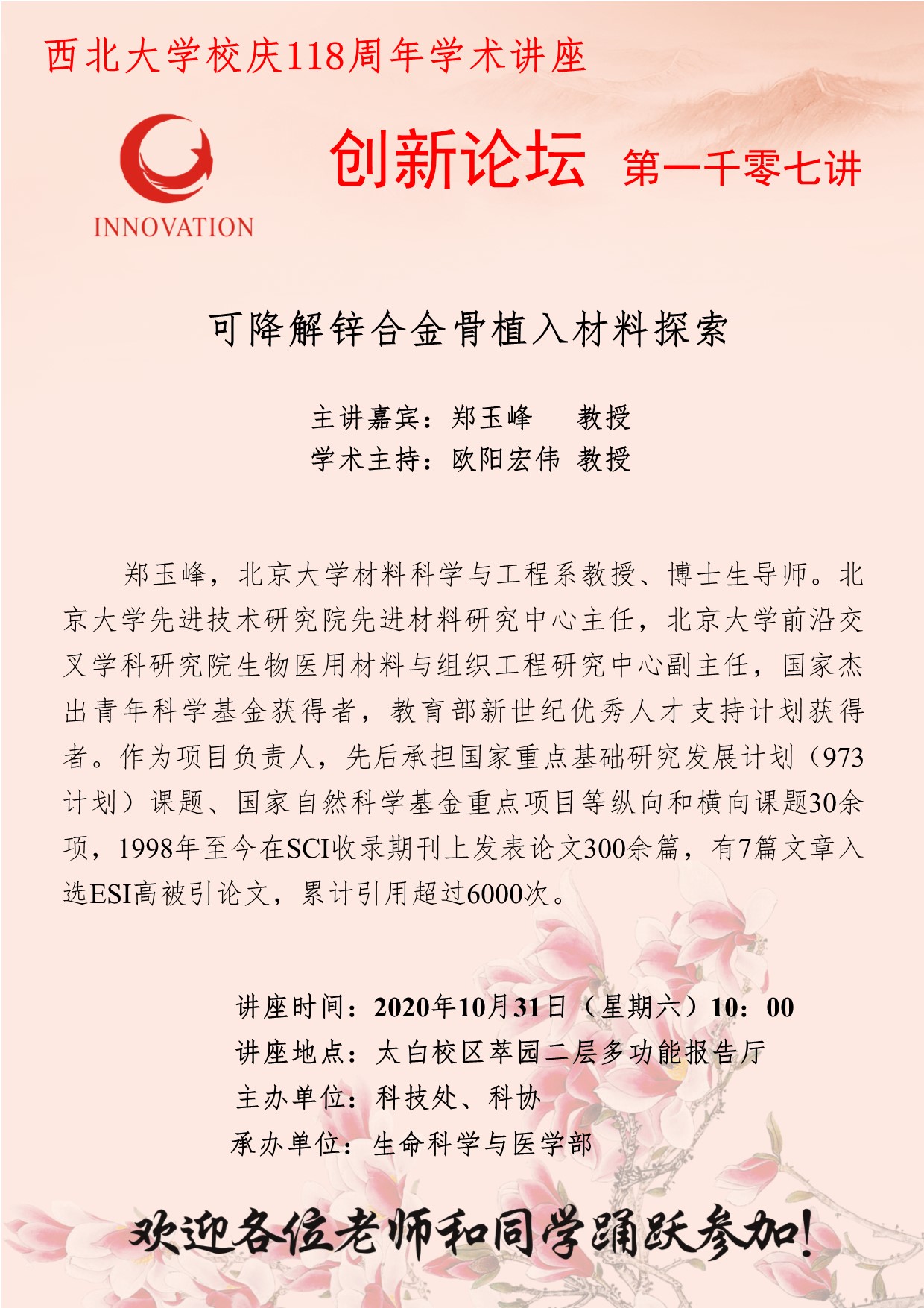 郑玉峰 教授 乐动网页版登录入口创新论坛第一千零七讲暨校庆118周年学术讲座:可降解锌合金骨植入材料探索 讲座时间 2020年10月31日(星期六)10:00 讲座地点 太白校区萃园二层多功能报告厅 讲座人介绍 郑玉峰 教授 讲座内容
