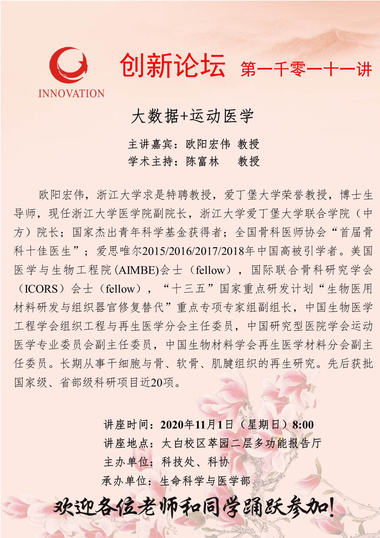 欧阳宏伟 教授 乐动网页版登录入口创新论坛第一千零一十一讲:大数据+运动医学 讲座时间 2020年11月1日(星期日)8:00 讲座地点 太白校区萃园二层多功能报告厅 讲座人介绍 欧阳宏伟 教授 讲座内容