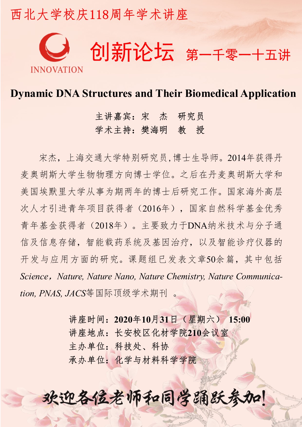 宋杰 研究员 乐动网页版登录入口创新论坛第一千零一十五讲暨校庆118周年学术讲座:Dynamic DNA Structures and Their Biomedical Application 讲座时间 2020年10月31日(星期六)15:00 讲座地点 化学与材料科学学院210室 讲座人介绍 宋杰 研究员 讲座内容