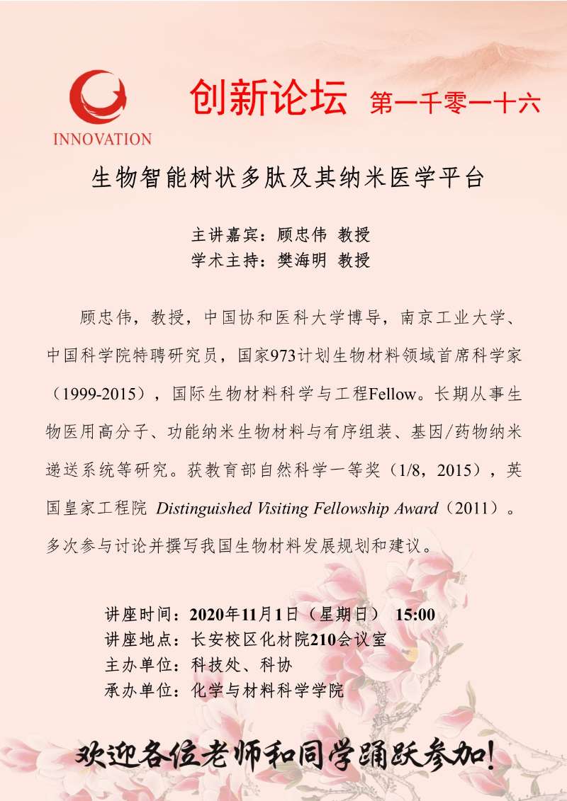 顾忠伟 教授 乐动网页版登录入口创新论坛第一千零一十六讲:生物智能树状多肽及其纳米医学平台 讲座时间 2020年11月1日(星期日) 15:00 讲座地点 长安校区化材院210会议室 讲座人介绍 顾忠伟 教授 讲座内容