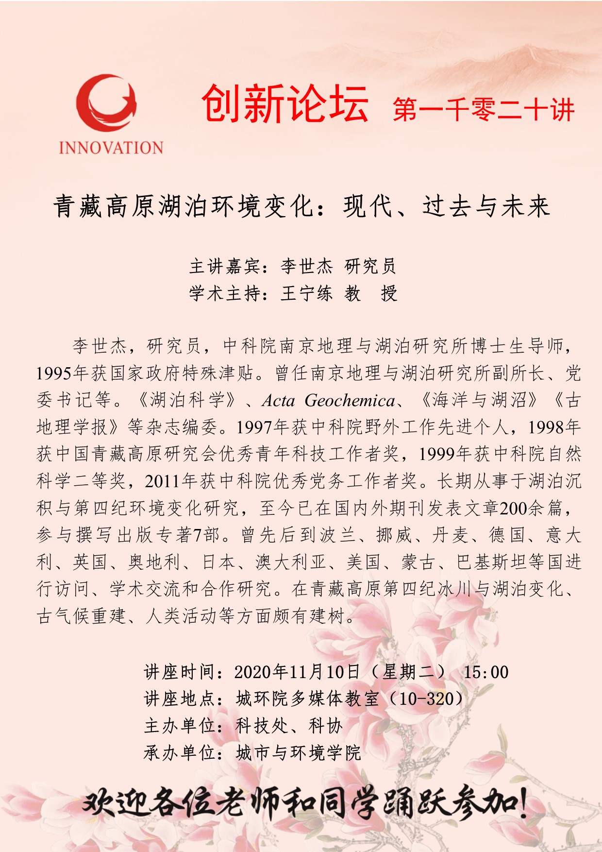 李世杰 研究员 乐动网页版登录入口创新论坛第一千零二十讲:青藏高原湖泊环境变化:现代、过去与未来 讲座时间 2020年11月10日(星期二) 15:00 讲座地点 城环院多媒体教室(10-320) 讲座人介绍 李世杰 研究员 讲座内容