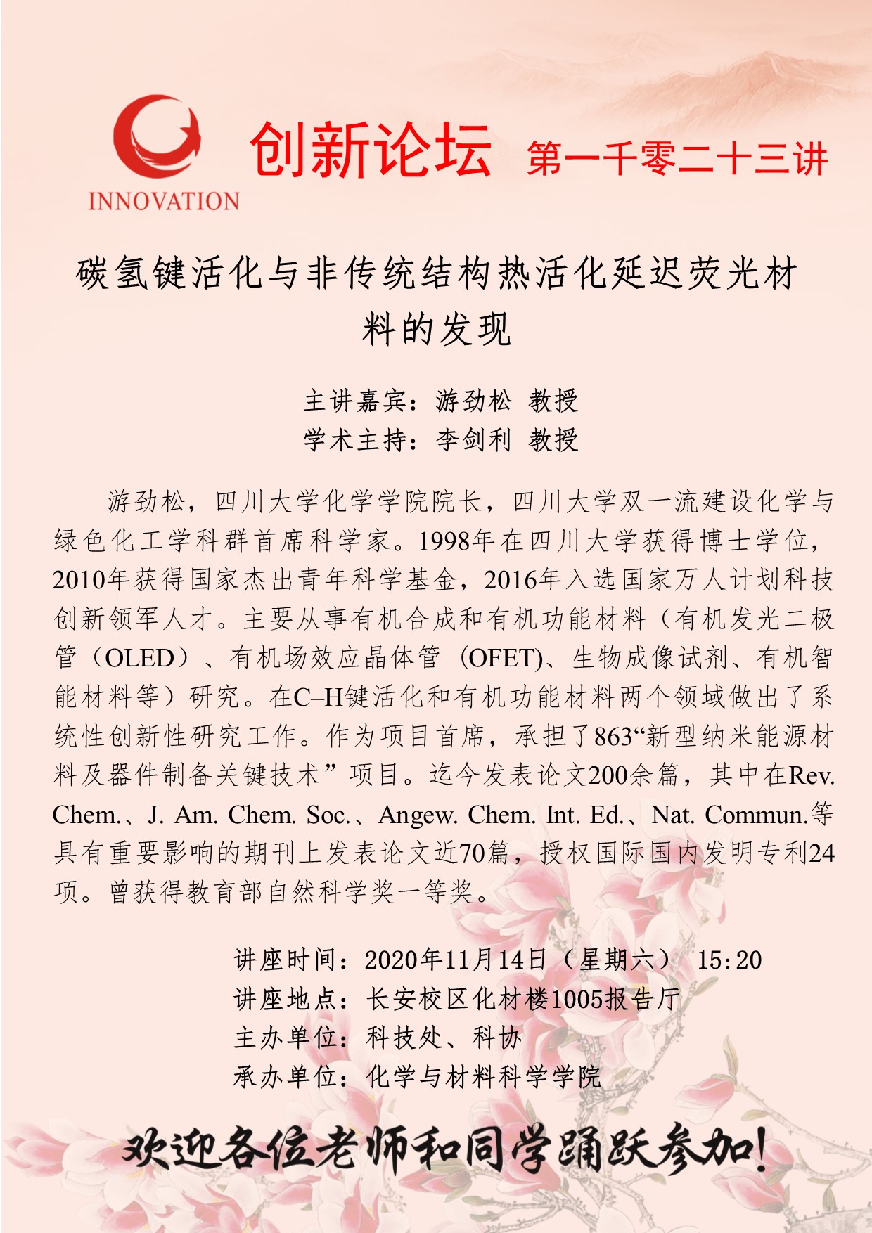 游劲松 教授 乐动网页版登录入口创新论坛第一千零二十三讲:碳氢键活化与非传统结构热活化延迟荧光材料的发现 讲座时间 2020年 11月14日(周六)15:20 讲座地点 长安校区化材楼1005报告厅 讲座人介绍 游劲松 教授 讲座内容