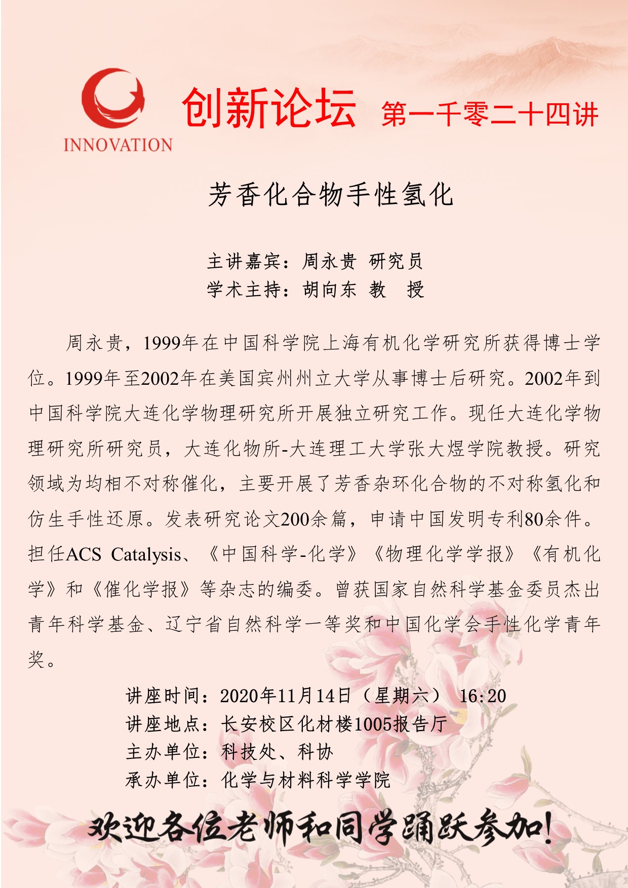 周永贵 研究员 乐动网页版登录入口创新论坛第一千零二十四讲:芳香化合物手性氢化 讲座时间 2020年11月14日(周六)16:20 讲座地点 长安校区化材楼1005报告厅 讲座人介绍 周永贵 研究员 讲座内容
