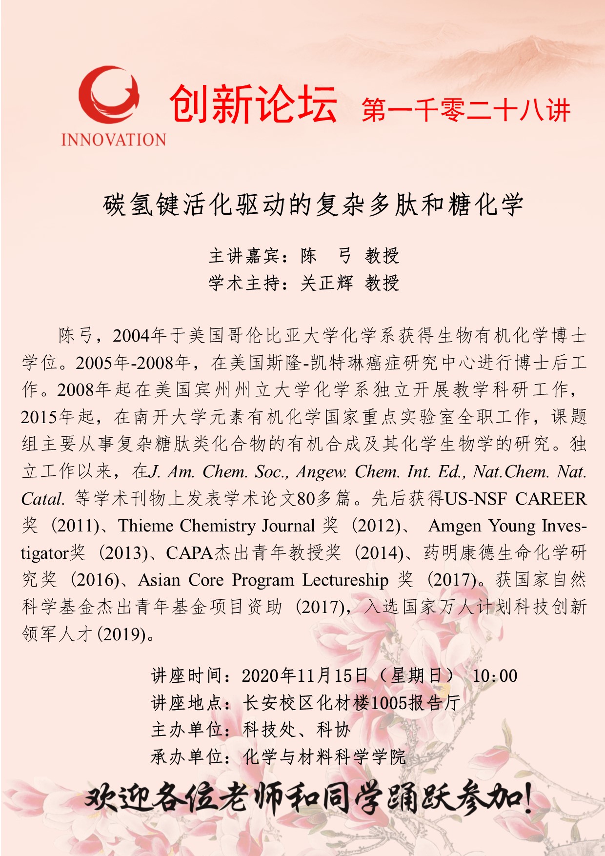 陈 弓 教授 乐动网页版登录入口创新论坛第一千零二十八讲:碳氢键活化驱动的复杂多肽和糖化学 讲座时间 2020年 11月15日(星期日)10:00 讲座地点 长安校区化材楼1005报告厅 讲座人介绍 陈 弓 教授 讲座内容
