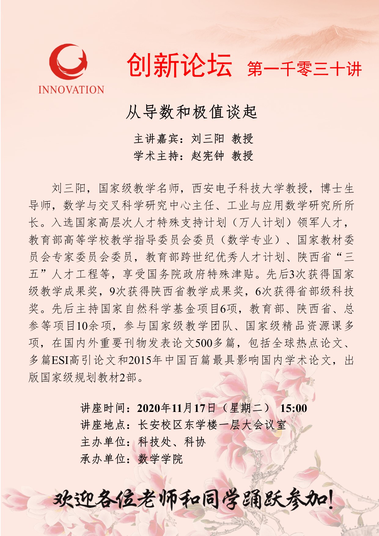刘三阳 教授 乐动网页版登录入口创新论坛第一千零三十讲:从导数和极值谈起 讲座时间 2020年11月17日(星期二) 15:00 讲座地点 长安校区东学楼一层大会议室 讲座人介绍 刘三阳 教授 讲座内容