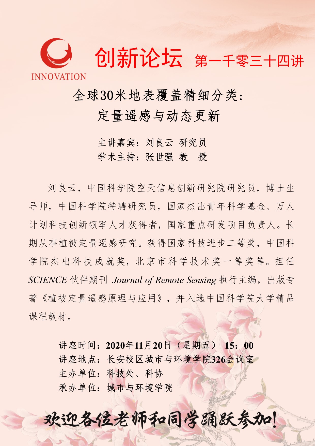 刘良云 研究员 乐动网页版登录入口创新论坛第一千零三十四讲:全球30米地表覆盖精细分类:定量遥感与动态更新 讲座时间 2020年11月20日(星期五) 15:00 讲座地点 长安校区城市与环境学院326会议室 讲座人介绍 刘良云 研究员 讲座内容