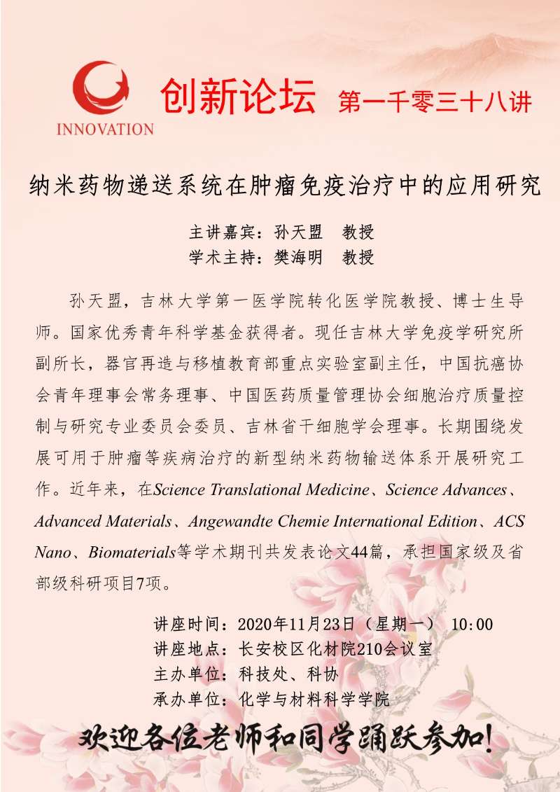 孙天盟 教授 乐动网页版登录入口创新论坛第一千零三十八讲:纳米药物递送系统在肿瘤免疫治疗中的应用研究 讲座时间 2020年11月23日(星期一) 10:00 讲座地点 长安校区化材院210会议室 讲座人介绍 孙天盟 教授 讲座内容