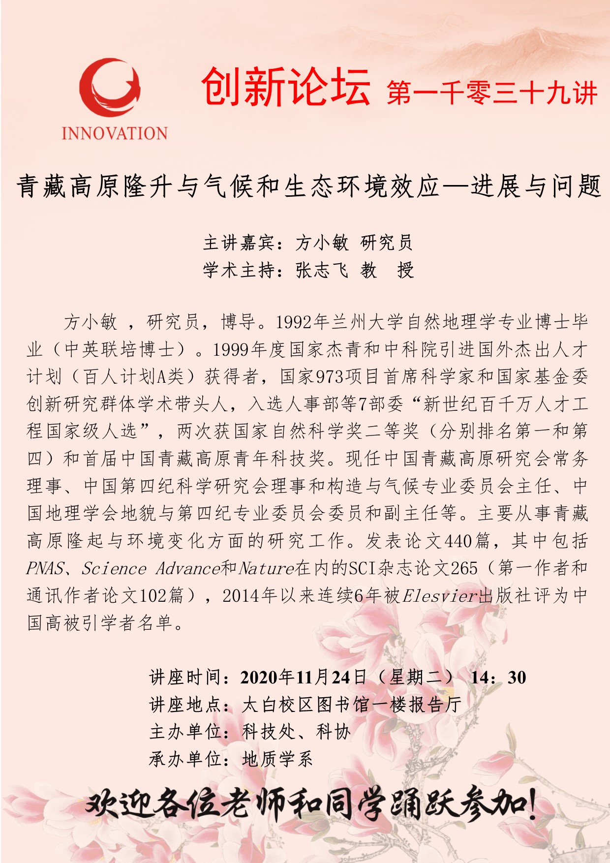 方小敏 研究员 乐动网页版登录入口创新论坛第一千零三十九讲:青藏高原隆升与气候和生态环境效应—进展与问题 讲座时间 2020年11月24日(星期二)14:30 讲座地点 太白校区图书馆一楼报告厅 讲座人介绍 方小敏 研究员 讲座内容