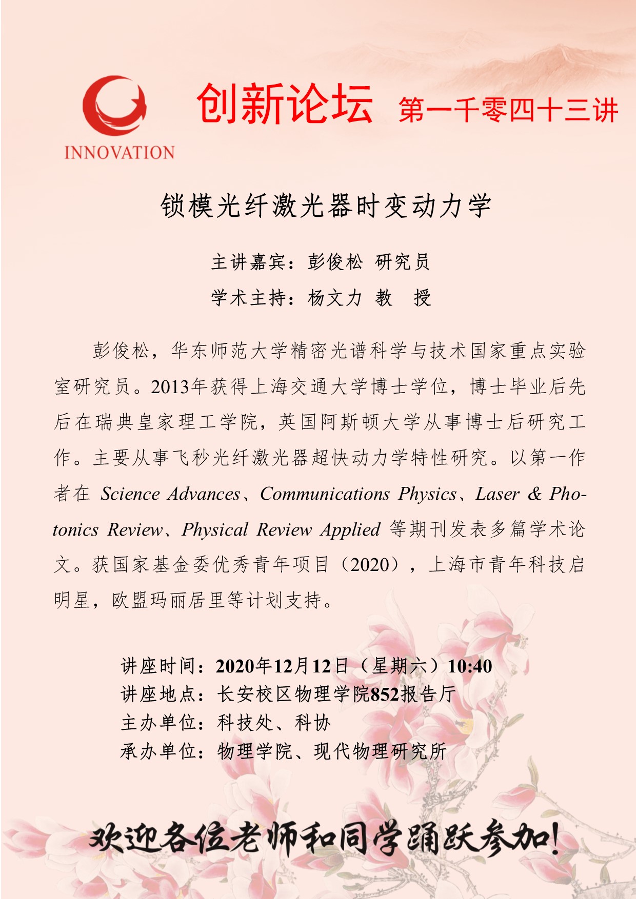 彭俊松 研究员 乐动网页版登录入口创新论坛第一千零四十三讲:锁模光纤激光器时变动力学 讲座时间 2020年12月12日(星期六)10:40 讲座地点 长安校区物理学院852报告厅 讲座人介绍 彭俊松 研究员 讲座内容