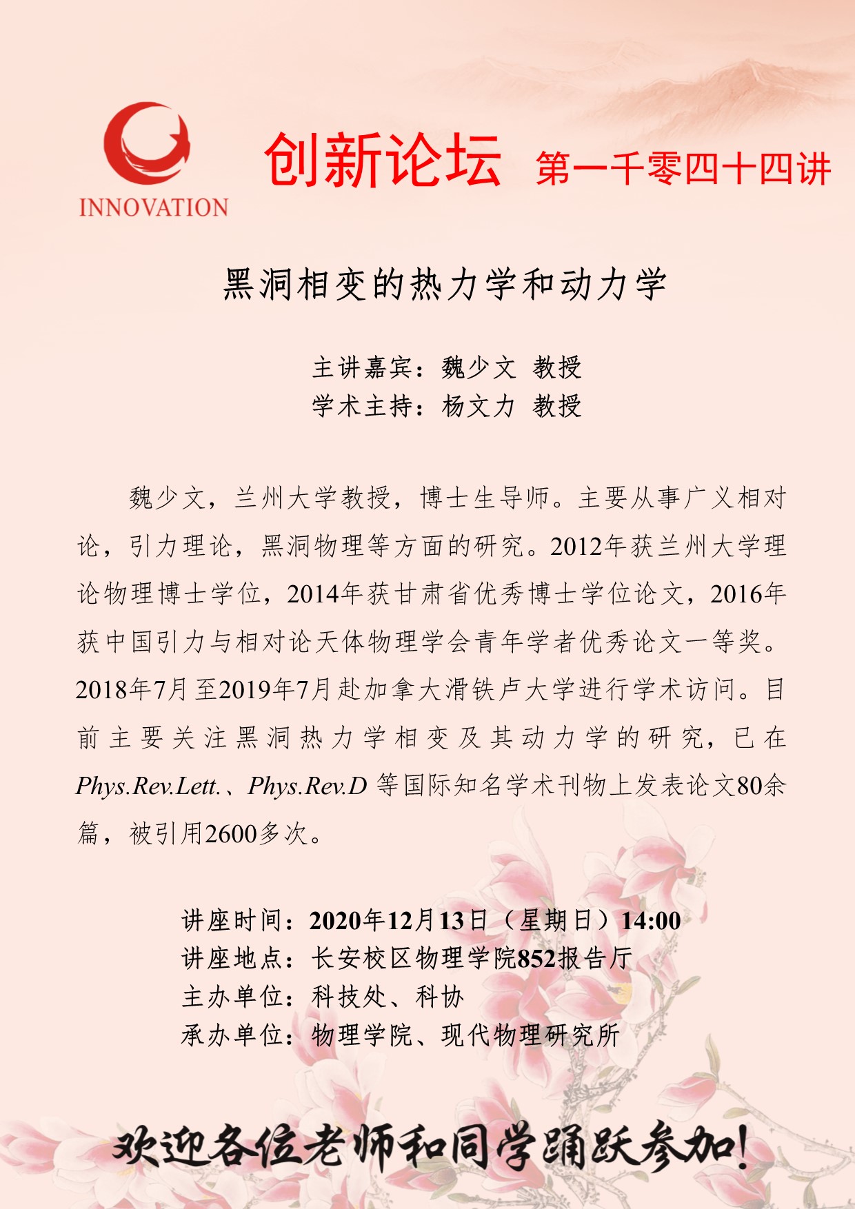 魏少文 教授 乐动网页版登录入口创新论坛第一千零四十四讲:黑洞相变的热力学和动力学 讲座时间 2020年12月13日(星期日)14:00 讲座地点 长安校区物理学院852报告厅 讲座人介绍 魏少文 教授 讲座内容