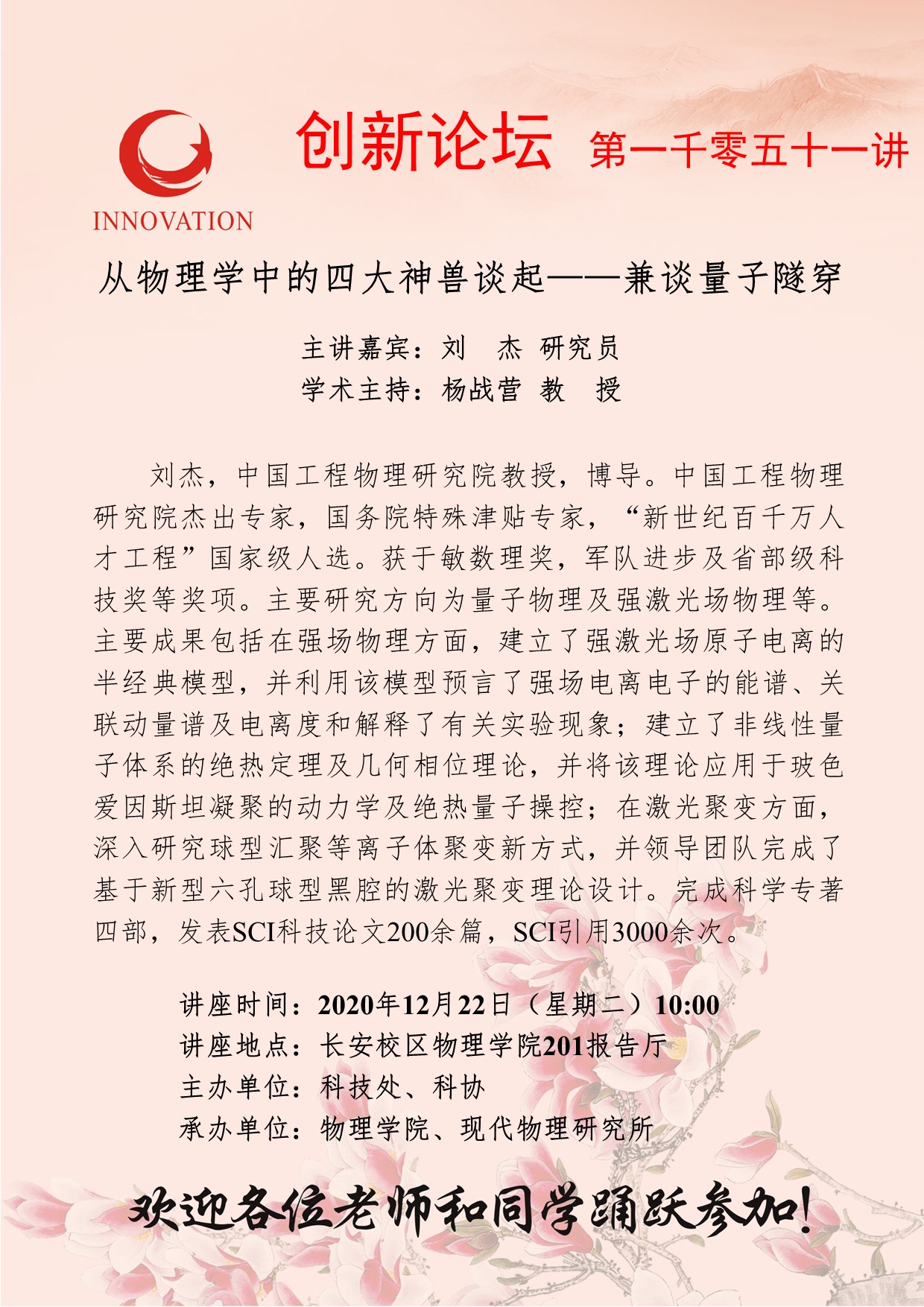 刘 杰 研究员 乐动网页版登录入口创新论坛第一千零五十一讲:从物理学中的四大神兽谈起——兼谈量子隧穿 讲座时间 2020年12月22日(星期二)10:00 讲座地点 长安校区物理学院201报告厅 讲座人介绍 刘 杰 研究员 讲座内容