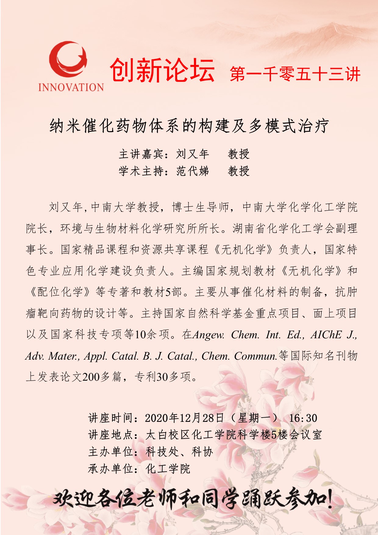 刘又年 教授 乐动网页版登录入口创新论坛第一千零五十三讲:纳米催化药物体系的构建及多模式治疗 讲座时间 2020年12月28日(星期一) 16:30 讲座地点 太白校区化工学院科学楼5楼会议室 讲座人介绍 刘又年 教授 讲座内容