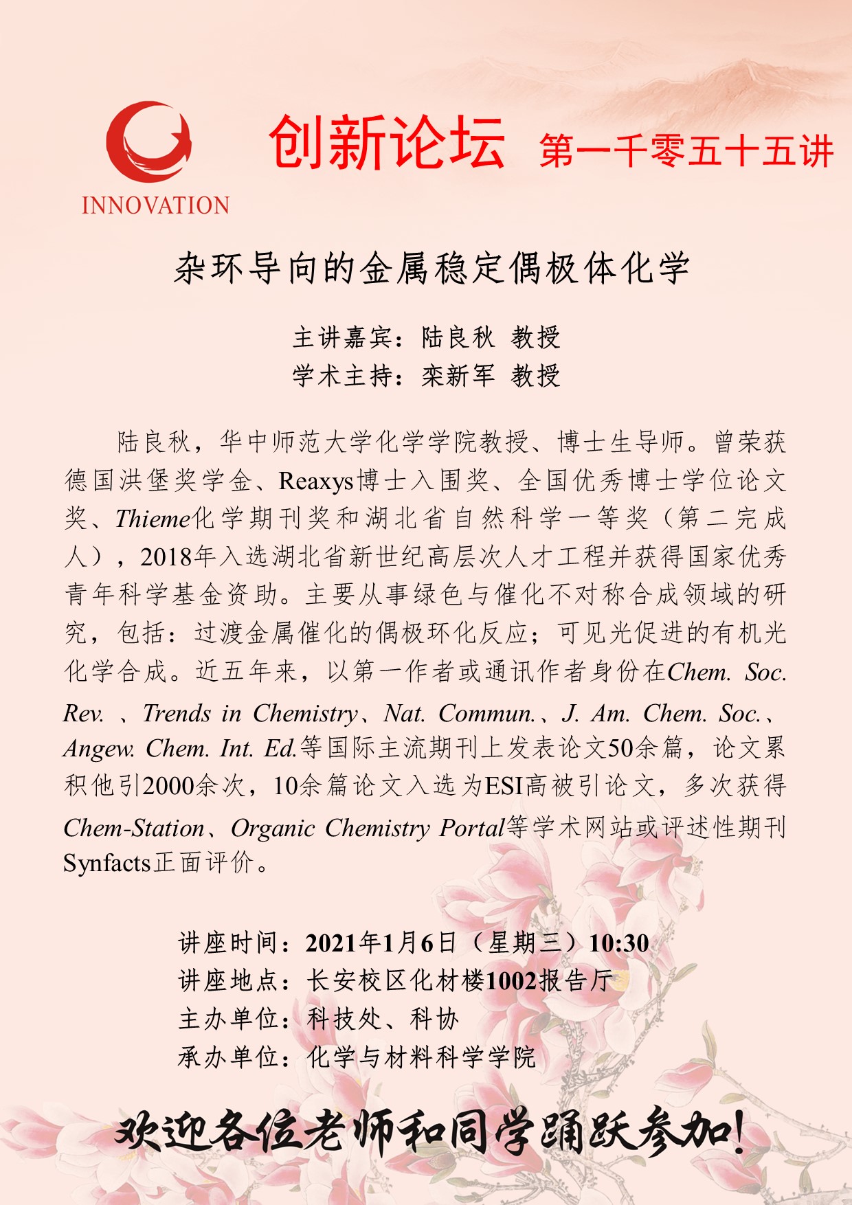 陆良秋 教授 乐动网页版登录入口创新论坛第一千零五十五讲:杂环导向的金属稳定偶极体化学 讲座时间 2021年1月6日(星期三)10:30 讲座地点 长安校区化材楼1002报告厅 讲座人介绍 陆良秋 教授 讲座内容