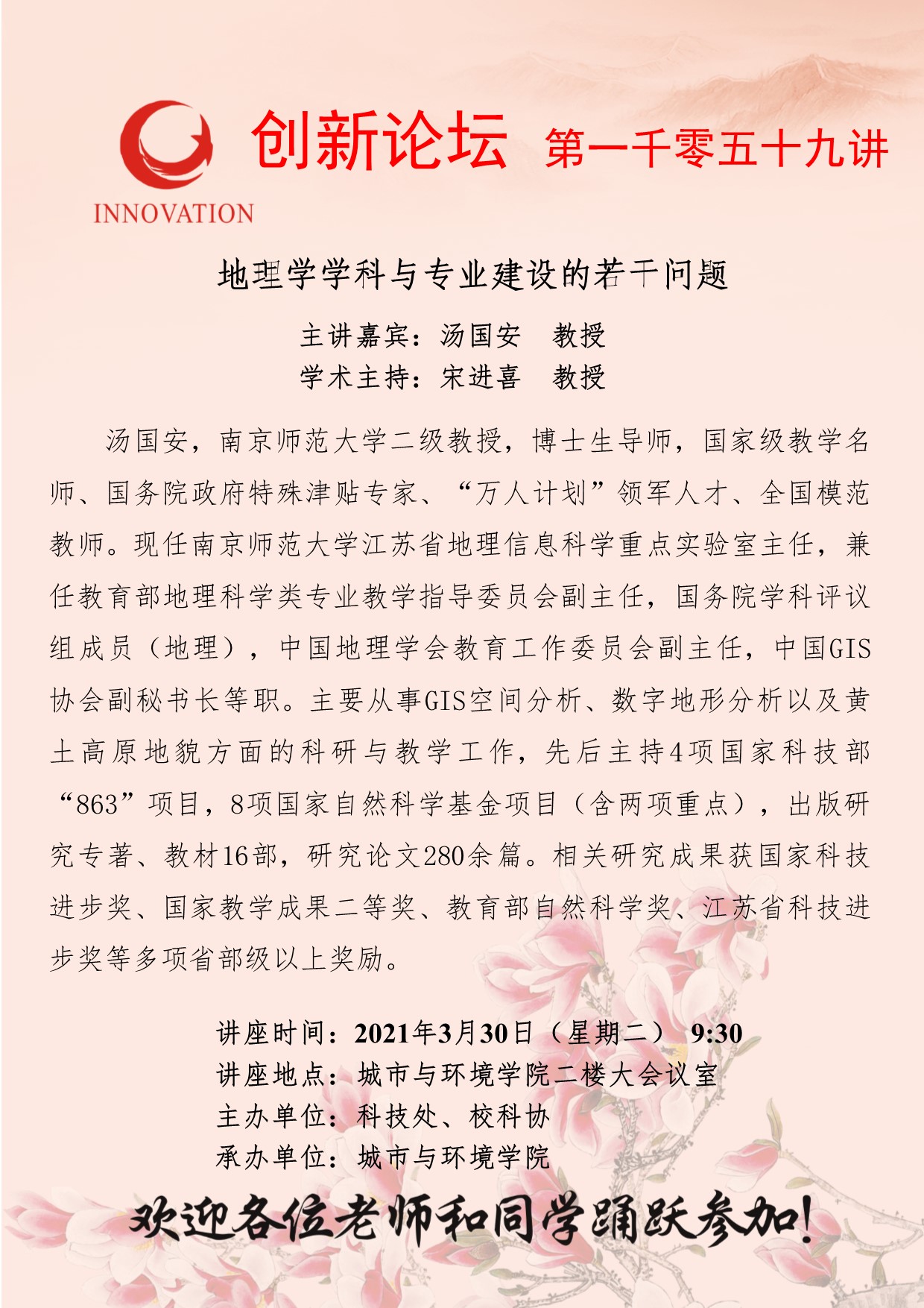 汤国安 教授 乐动网页版登录入口创新论坛第一千零五十九讲:地理学学科与专业建设的若干问题 讲座时间 2021年3月30日(星期二) 9:30 讲座地点 城市与环境学院二楼大会议室 讲座人介绍 汤国安 教授 讲座内容