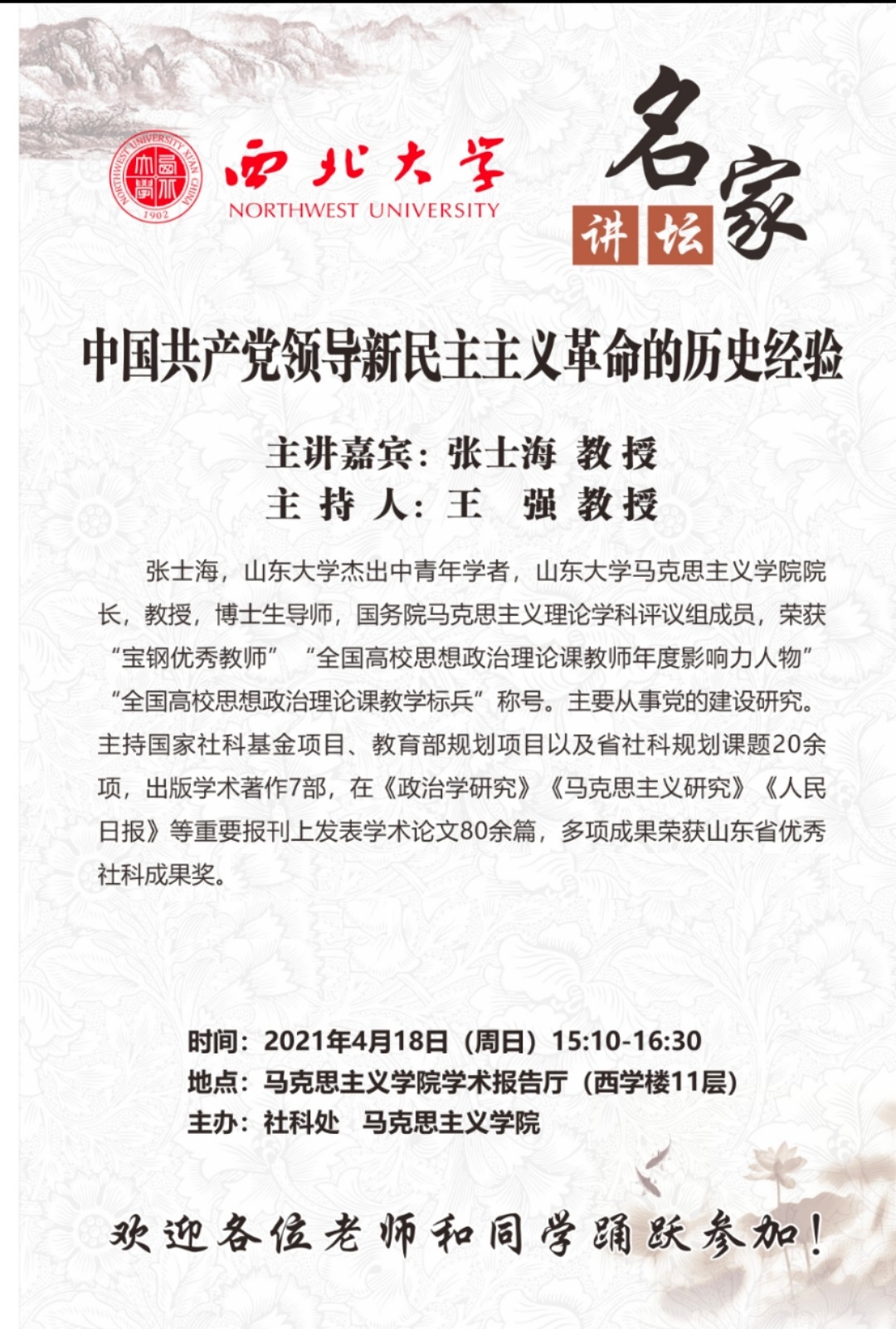 张士海 教授 名家讲坛:中国共产党领导新民主主义革命的历史经验 讲座时间 2021年4月18日(周日)15:10 讲座地点 长安校区马克思主义学院学术报告厅(西学楼11层) 讲座人介绍 张士海 教授 讲座内容