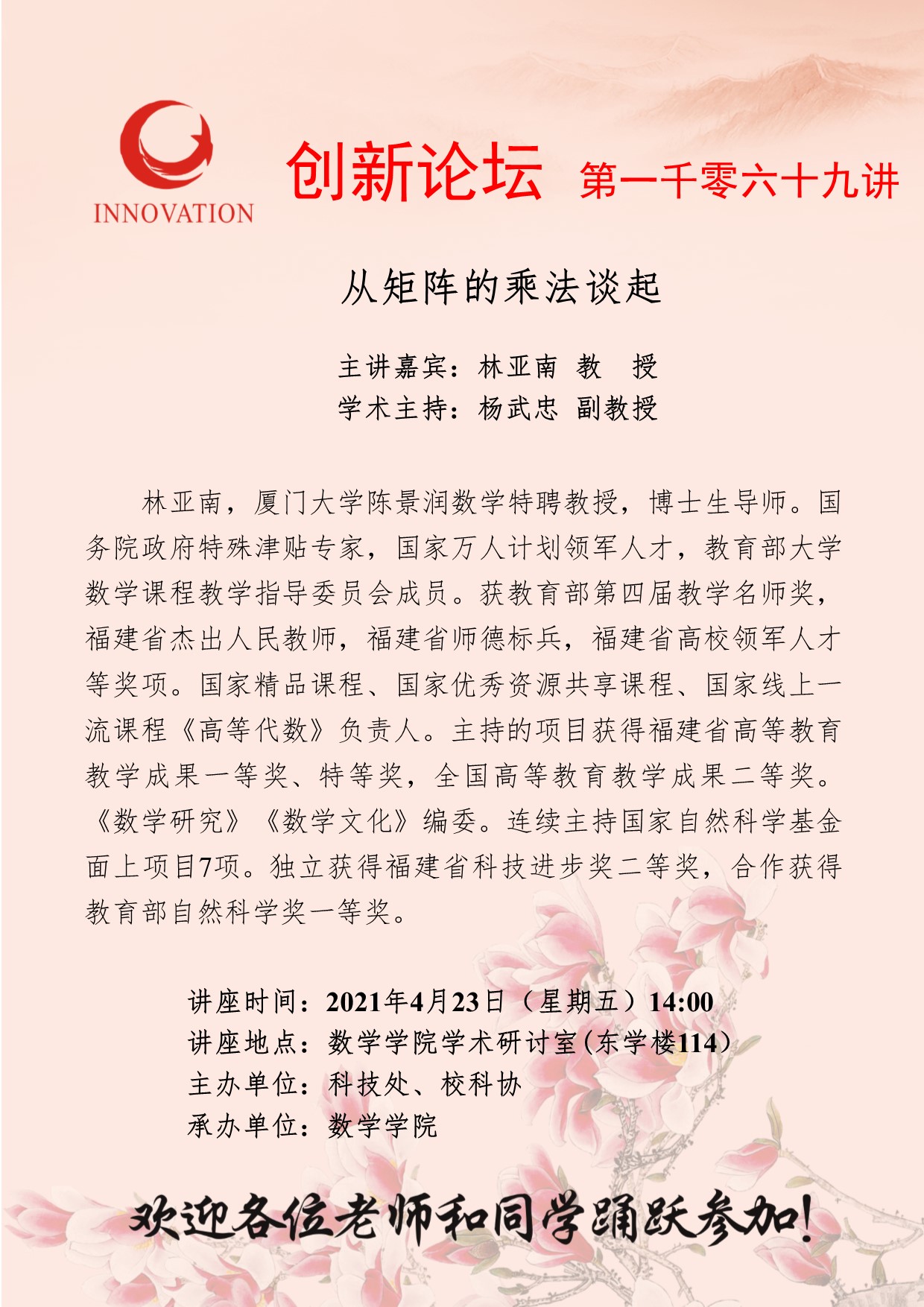林亚南 教授 乐动网页版登录入口创新论坛第一千零六十九讲:从矩阵的乘法谈起 讲座时间 2021年4月23日(星期五)14:00 讲座地点 数学学院学术研讨室(东学楼114) 讲座人介绍 林亚南 教授 讲座内容