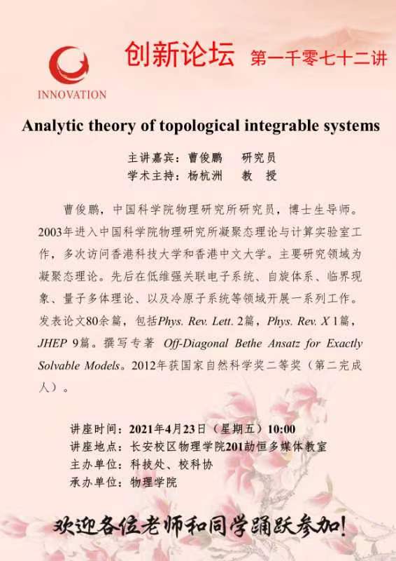 曹俊鹏 研究员 乐动网页版登录入口创新论坛第一千零七十二讲:Analytic theory of topological integrable systems 讲座时间 2021年4月23日(星期五)10:00 讲座地点 长安校区物理学院201劼恒多媒体教室 讲座人介绍 曹俊鹏 研究员 讲座内容