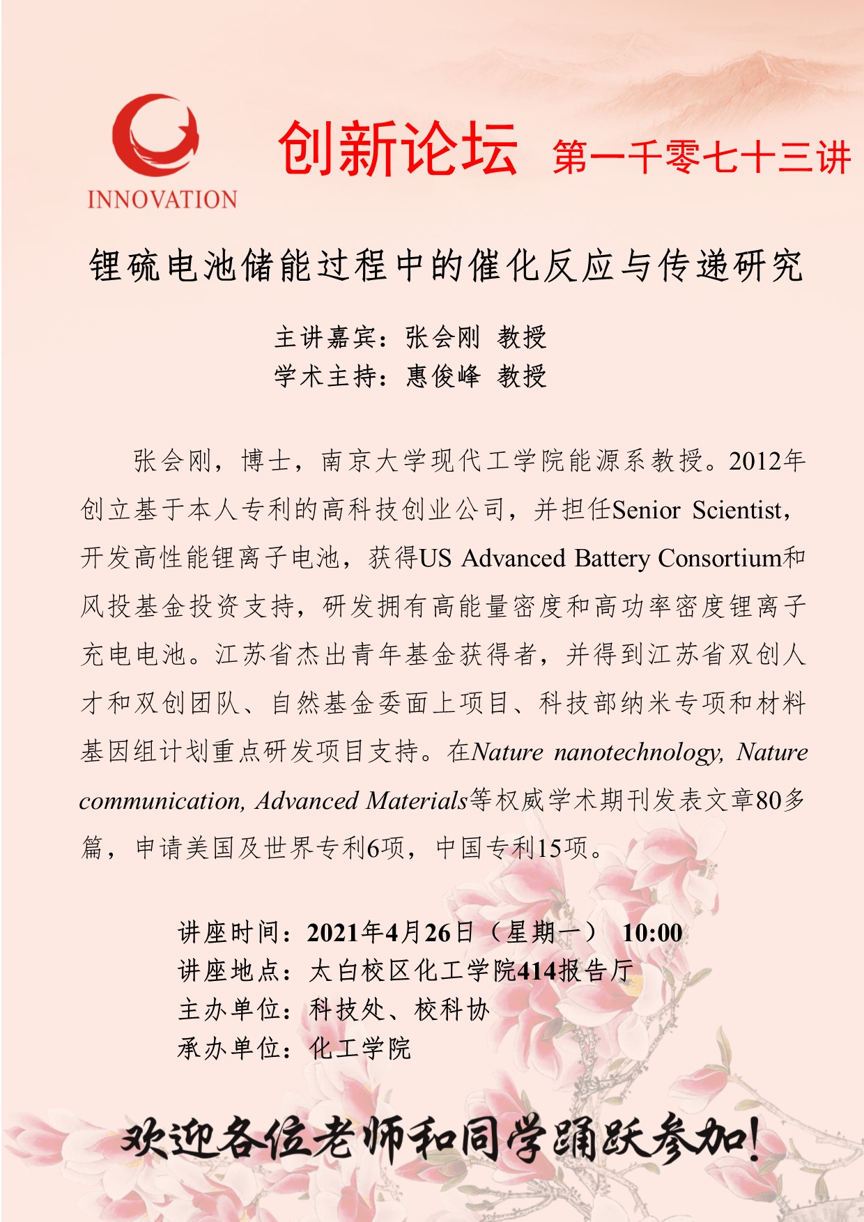 张会刚 教授 乐动网页版登录入口创新论坛第一千零七十三讲:锂硫电池储能过程中的催化反应与传递研究 讲座时间 2021年4月26日(星期一) 10:00 讲座地点 太白校区化工学院414报告厅 讲座人介绍 张会刚 教授 讲座内容