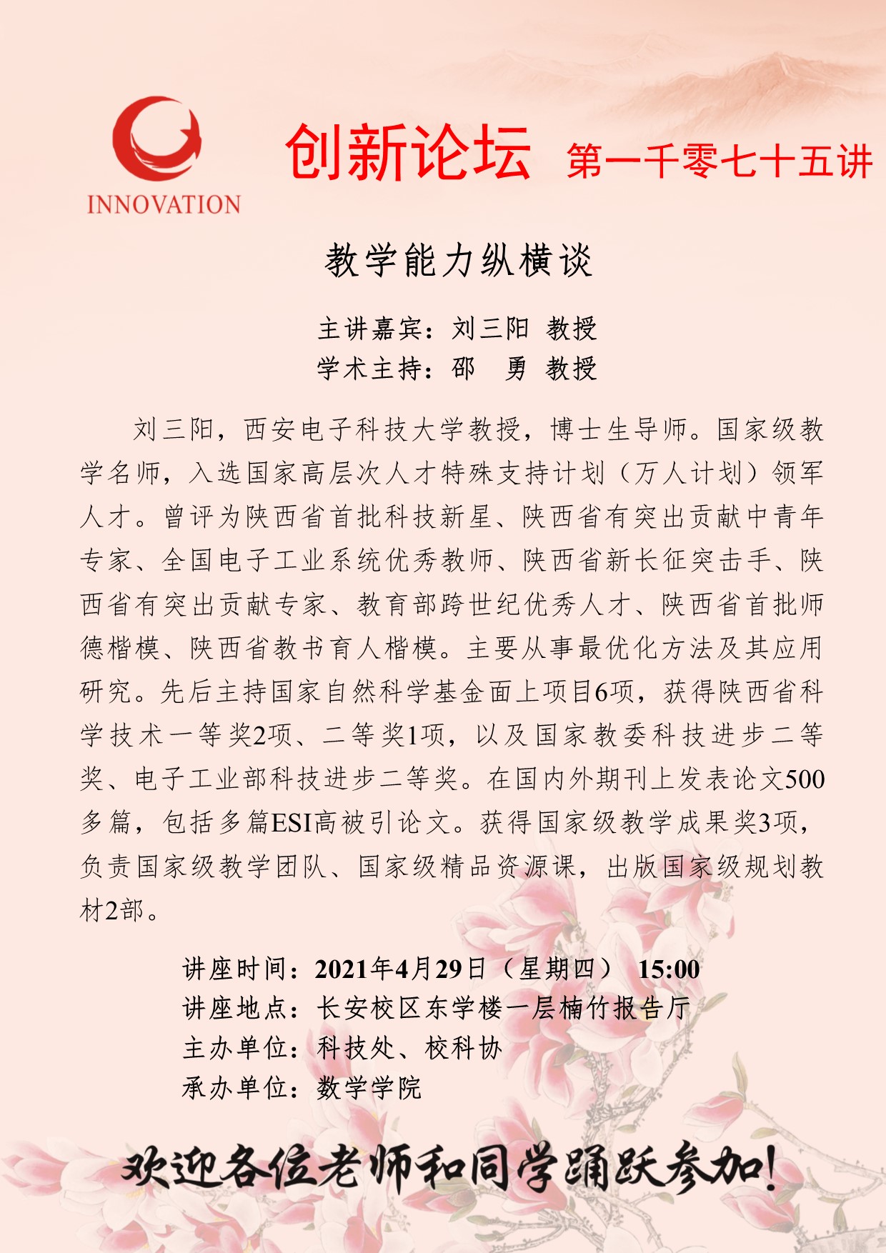 刘三阳 教授 乐动网页版登录入口创新论坛第一千零七十五讲:教学能力纵横谈 讲座时间 2021年4月29日(星期四) 15:00 讲座地点 长安校区东学楼一层楠竹报告厅 讲座人介绍 刘三阳 教授 讲座内容