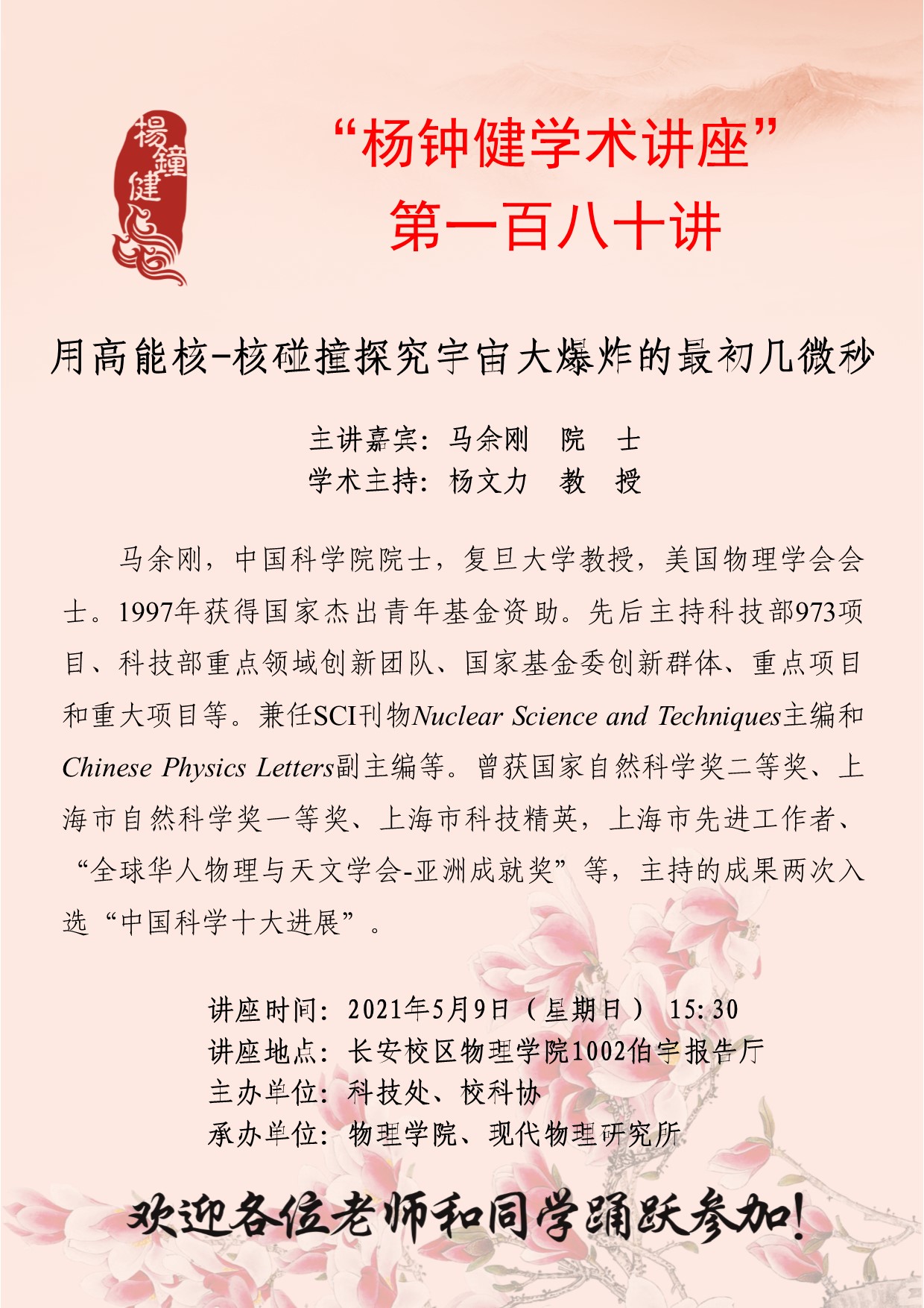 马余刚 院士 “杨钟健学术讲座”第一百八十讲:用高能核-核碰撞探究宇宙大爆炸的最初几微秒 讲座时间 2021年5月9日(星期日)15:30 讲座地点 长安校区物理学院1002伯宇报告厅 讲座人介绍 马余刚 院士 讲座内容