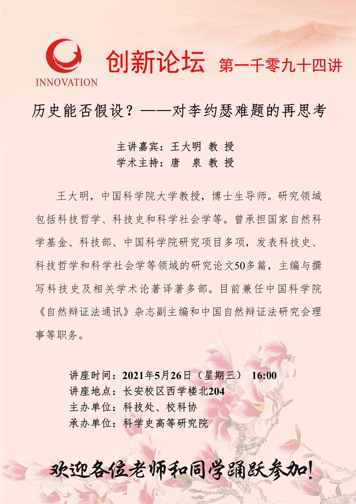 王大明 教 授 乐动网页版登录入口创新论坛第一千零九十四讲:历史能否假设?——对李约瑟难题的再思考 讲座时间 2021年5月26日(星期三) 16:00 讲座地点 长安校区西学楼北204 讲座人介绍 王大明 教 授 讲座内容