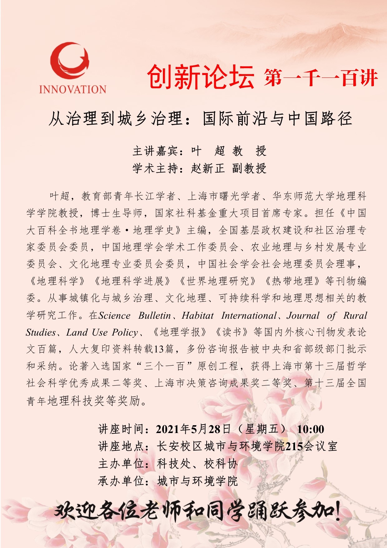 叶超 教授 乐动网页版登录入口创新论坛第一千一百讲:从治理到城乡治理:国际前沿与中国路径 讲座时间 2021年5月28日(星期五)10:00 讲座地点 长安校区城市与环境学院215会议室 讲座人介绍 叶超 教授 讲座内容