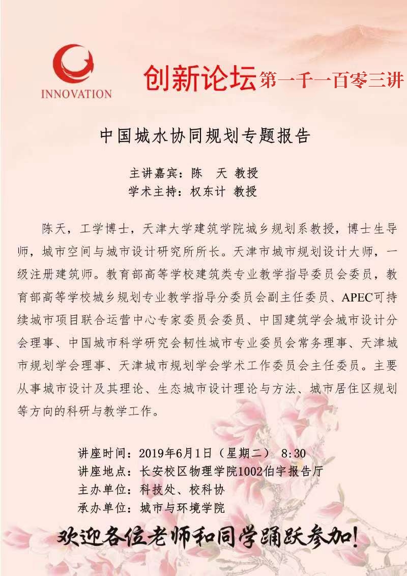 陈天 教授 乐动网页版登录入口创新论坛第一千一百零三讲:中国城水协同规划专题报告 讲座时间 2021年6月1日(星期二)8:30 讲座地点 长安校区物理学院1002伯宇报告厅 讲座人介绍 陈天 教授 讲座内容