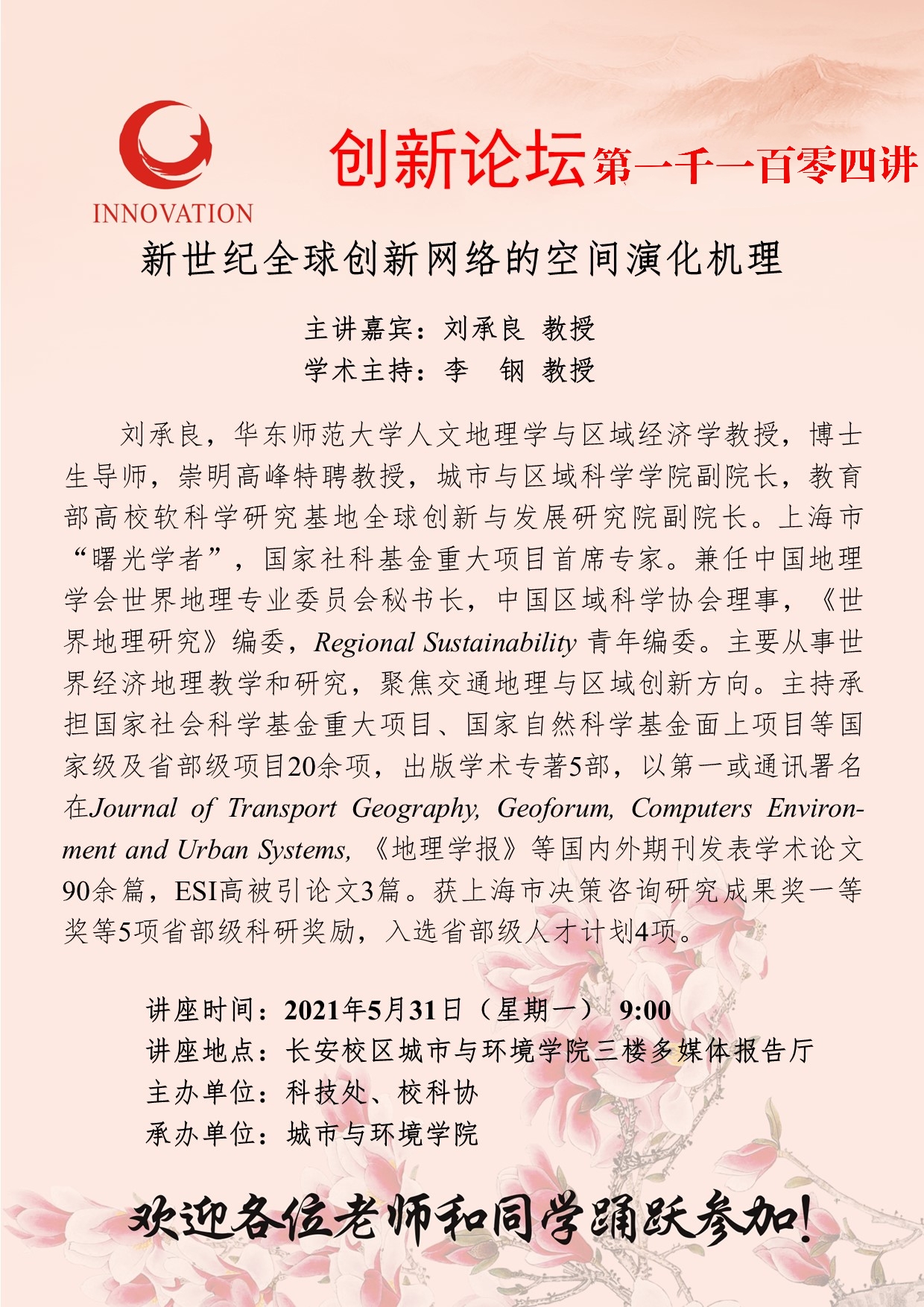 刘承良 教授 乐动网页版登录入口创新论坛第一千一百零四讲:新世纪全球创新网络的空间演化机理 讲座时间 2021年5月31日(星期一) 9:00 讲座地点 长安校区城市与环境学院三楼多媒体报告厅 讲座人介绍 刘承良 教授 讲座内容