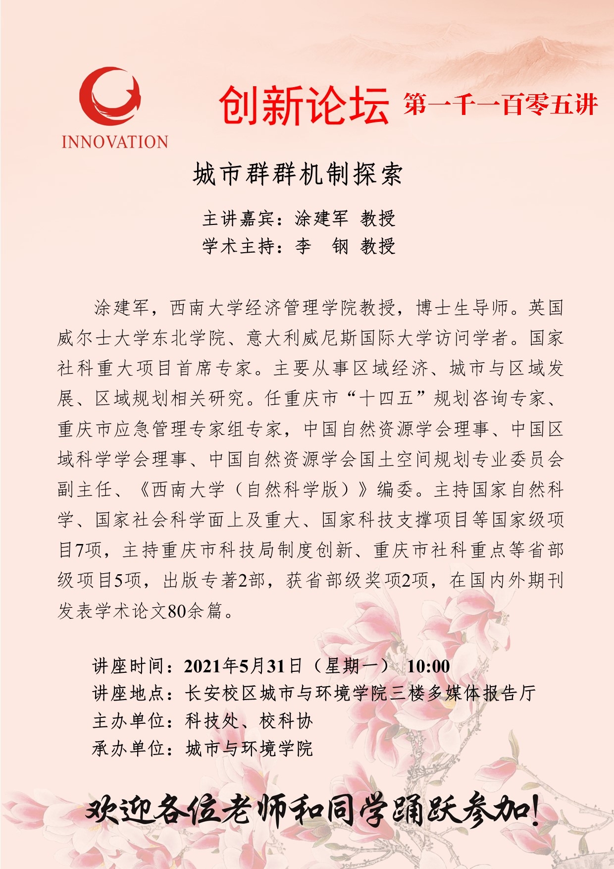 涂建军 教授 乐动网页版登录入口创新论坛第一千一百零五讲:城市群群机制探索 讲座时间 2021年5月31日(星期一) 10:00 讲座地点 长安校区城市与环境学院三楼多媒体报告厅 讲座人介绍 涂建军 教授 讲座内容