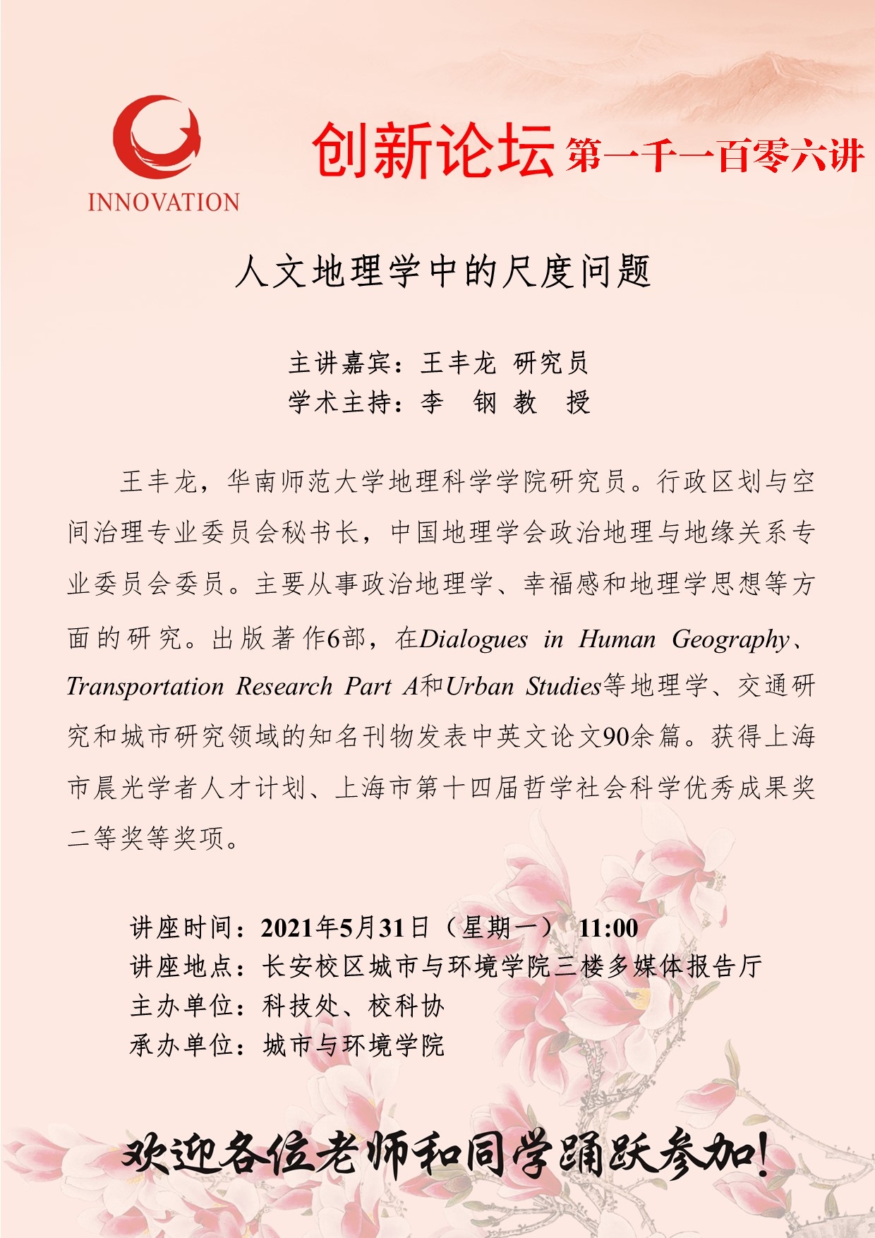 王丰龙 研究员 乐动网页版登录入口创新论坛第一千一百零六讲:人文地理学中的尺度问题 讲座时间 2021年5月31日(星期一) 11:00 讲座地点 长安校区城市与环境学院三楼多媒体报告厅 讲座人介绍 王丰龙 研究员 讲座内容
