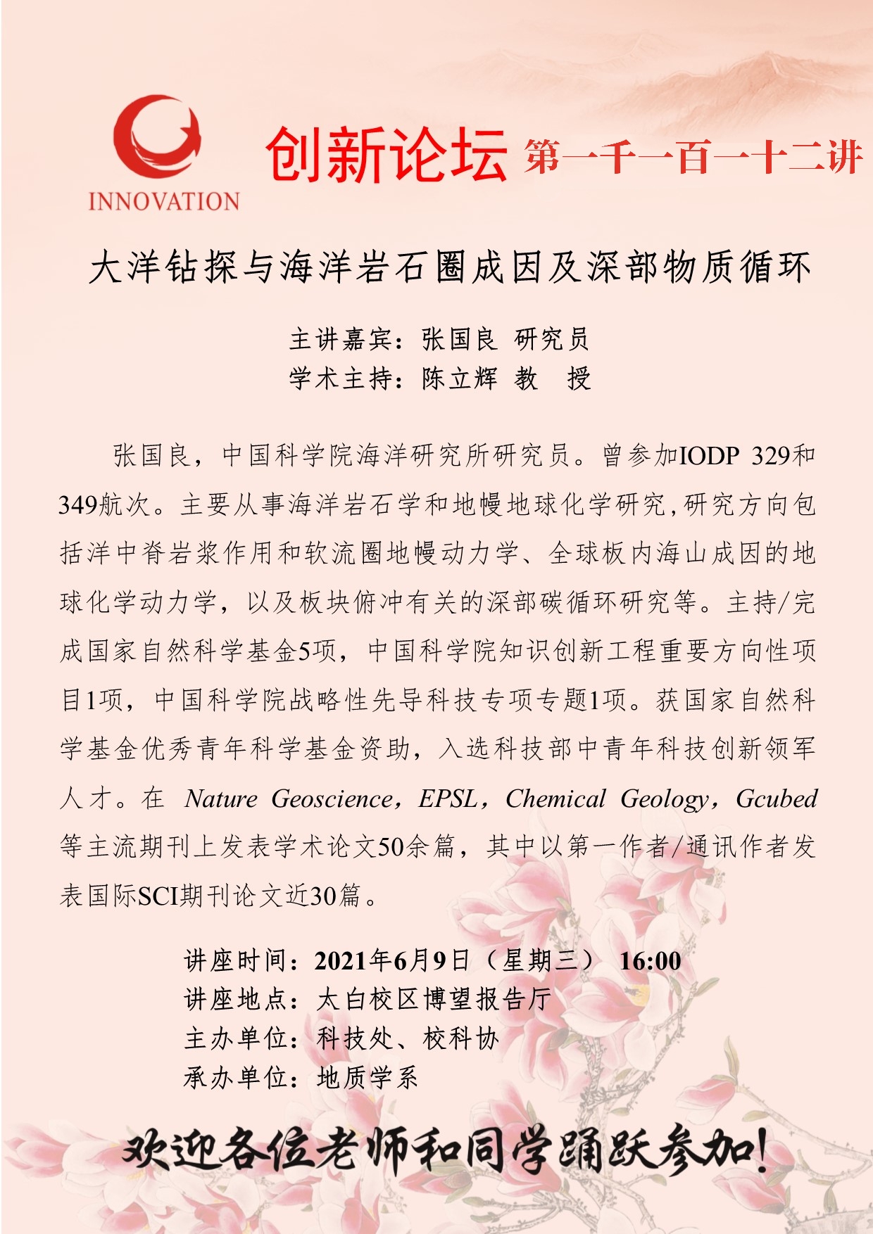 张国良 研究员 乐动网页版登录入口创新论坛第一千一百一十二讲:大洋钻探与海洋岩石圈成因及深部物质循环 讲座时间 2021年6月9日(星期三) 16:00 讲座地点 太白校区博望报告厅 讲座人介绍 张国良 研究员 讲座内容