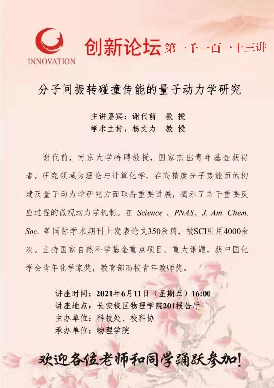 谢代前 教 授 乐动网页版登录入口创新论坛第一千一百一十三讲:分子间振转碰撞传能的量子动力学研究 讲座时间 2021年6月11日(星期五)16:00 讲座地点 长安校区物理学院201报告厅 讲座人介绍 谢代前 教 授 讲座内容