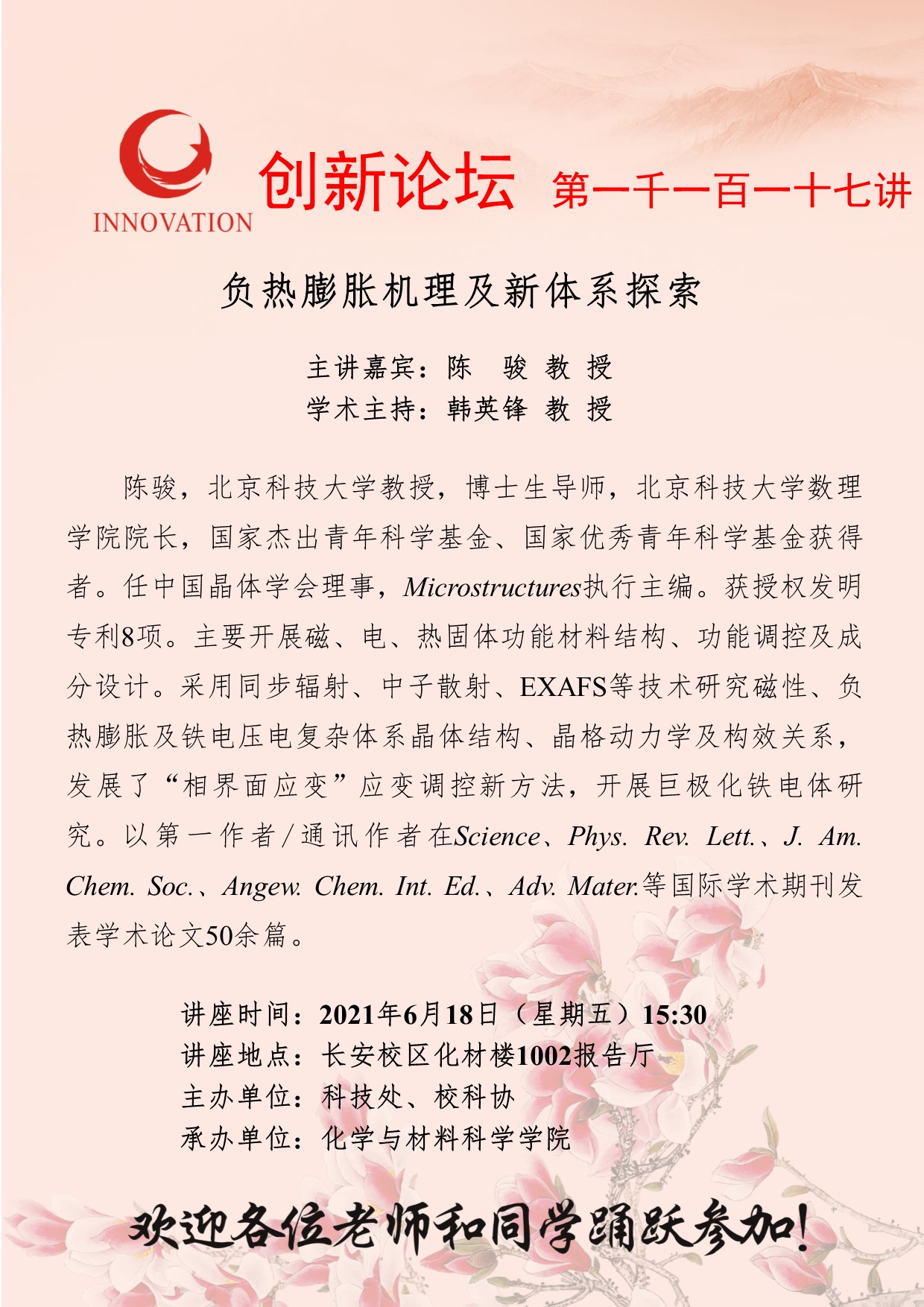 陈骏 教授 乐动网页版登录入口创新论坛第一千一百一十七讲:负热膨胀机理及新体系探索 讲座时间 2021年6月18日(星期五)15:30 讲座地点 长安校区化材楼1002报告厅 讲座人介绍 陈骏 教授 讲座内容