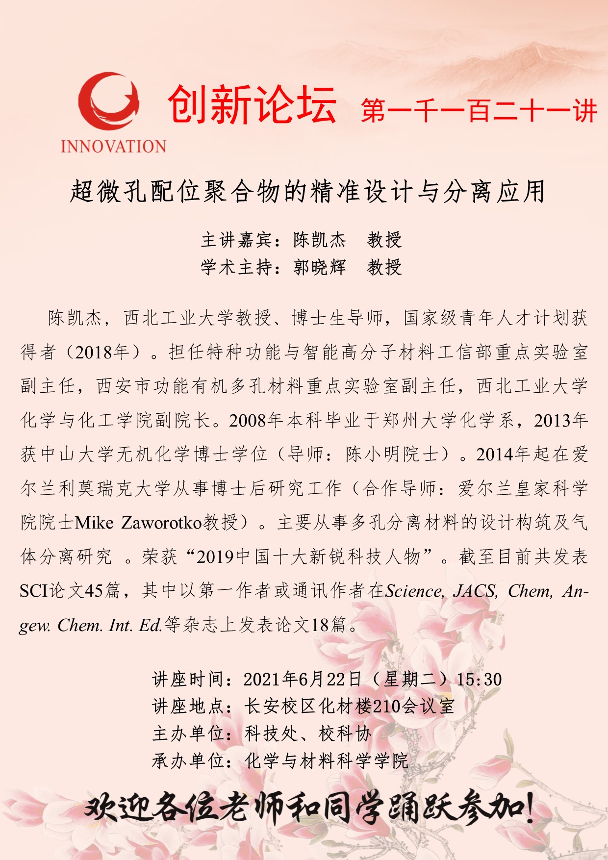 陈凯杰 教授 乐动网页版登录入口创新论坛第一千一百二十一讲:超微孔配位聚合物的精准设计与分离应用 讲座时间 2021年6月22日(星期二)15:30 讲座地点 长安校区化材楼210会议室 讲座人介绍 陈凯杰 教授 讲座内容