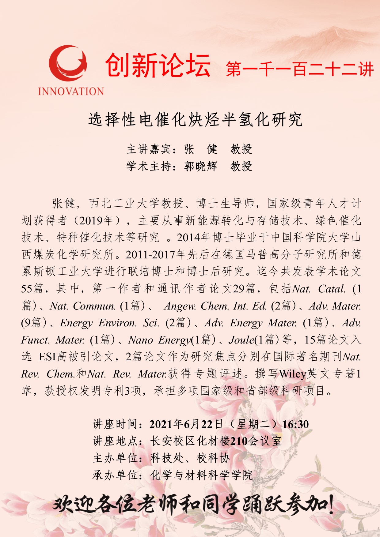 张 健 教授 乐动网页版登录入口创新论坛第一千一百二十二讲:选择性电催化炔烃半氢化研究 讲座时间 2021年6月22日(星期二)16:30 讲座地点 长安校区化材楼210会议室 讲座人介绍 张 健 教授 讲座内容