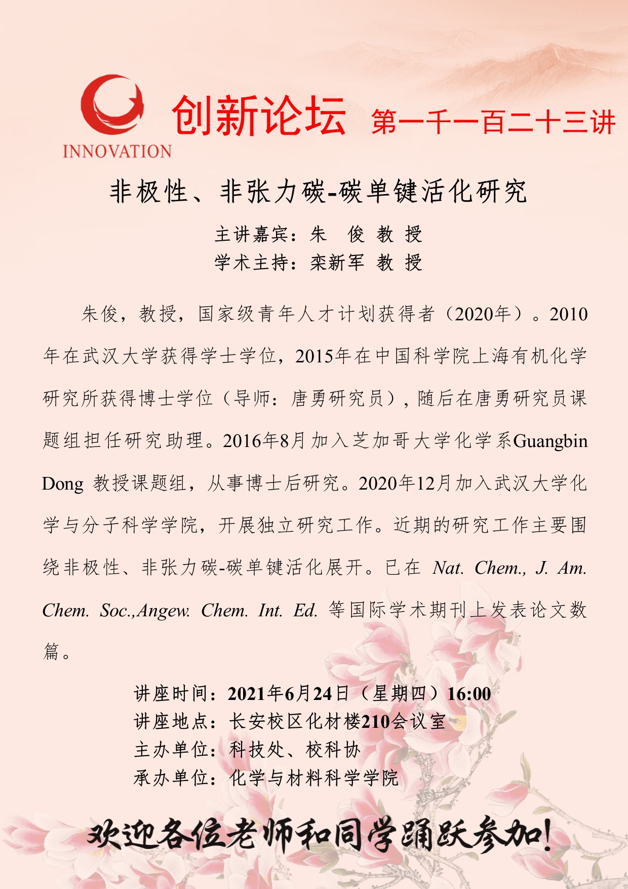 朱 俊 教 授 乐动网页版登录入口创新论坛第一千一百二十三讲:非极性、非张力碳-碳单键活化研究 讲座时间 2021年6月24日(星期四)16:00 讲座地点 长安校区化材楼210会议室 讲座人介绍 朱 俊 教 授 讲座内容