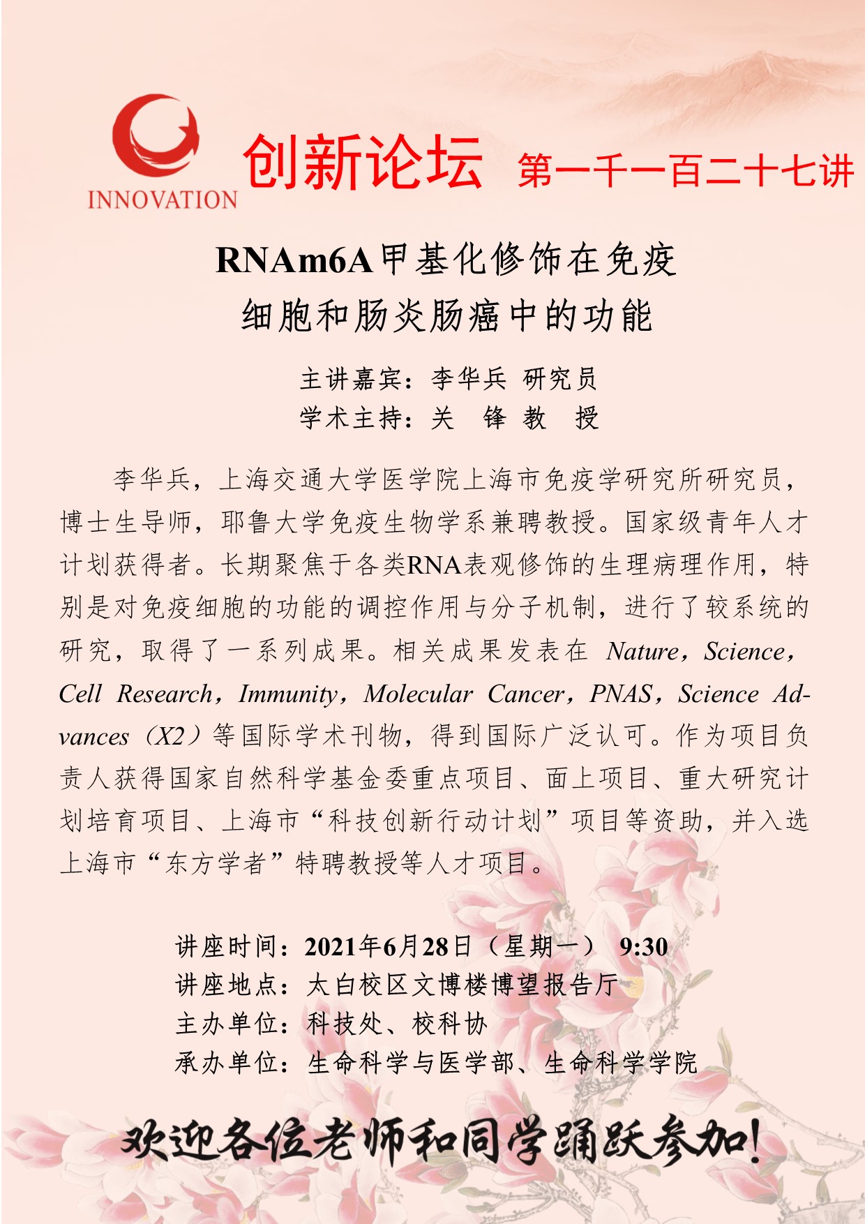 李华兵 研究员 乐动网页版登录入口创新论坛第一千一百二十七讲:RNAm6A甲基化修饰在免疫细胞和肠炎肠癌中的功能 讲座时间 2021年6月28日(星期一) 9:30 讲座地点 太白校区文博楼博望报告厅 讲座人介绍 李华兵 研究员 讲座内容