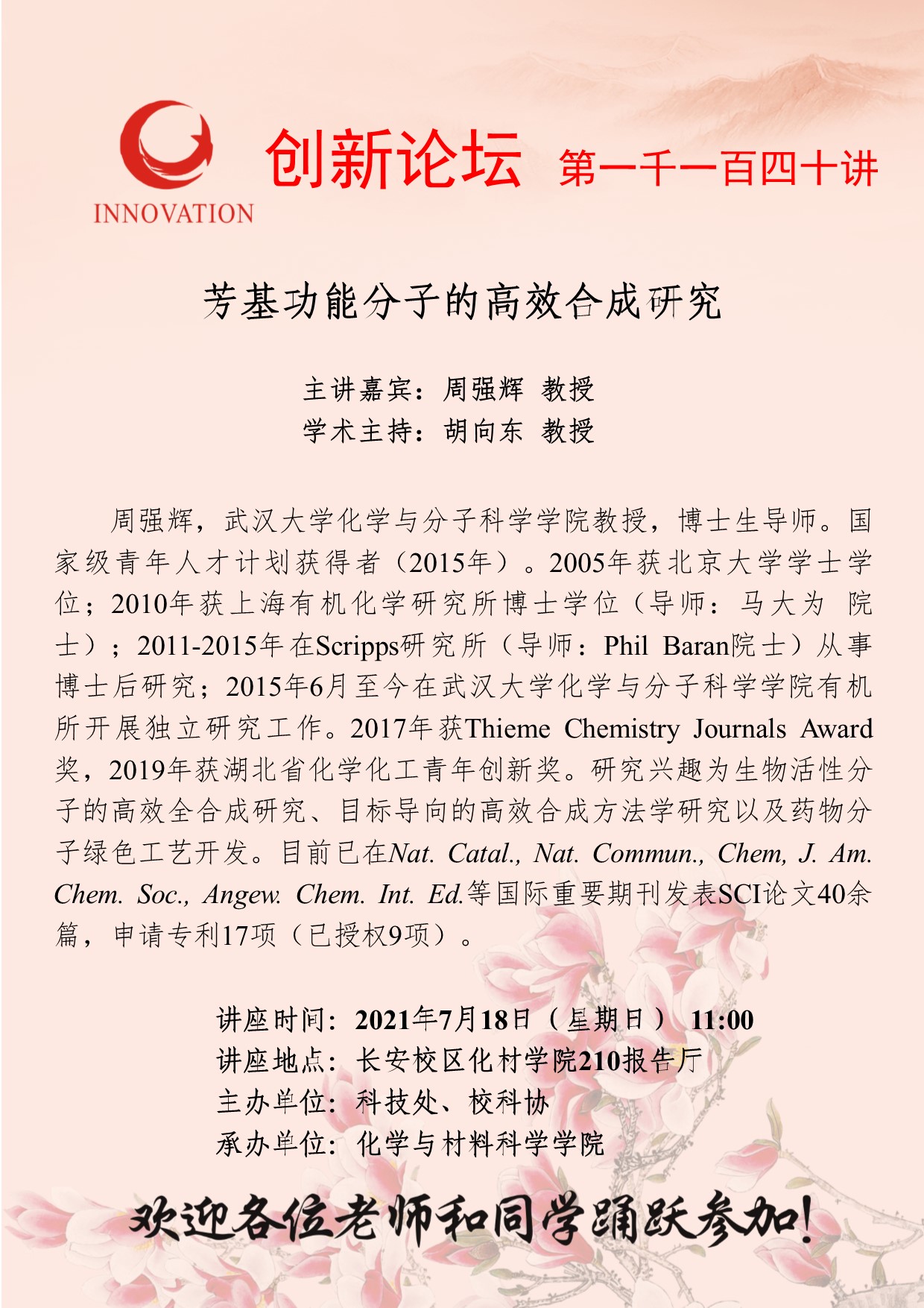 周强辉 教授 乐动网页版登录入口创新论坛第一千一百四十讲:芳基功能分子的高效合成研究 讲座时间 2021年7月18日(星期日) 11:00 讲座地点 长安校区化材学院210报告厅 讲座人介绍 周强辉 教授 讲座内容