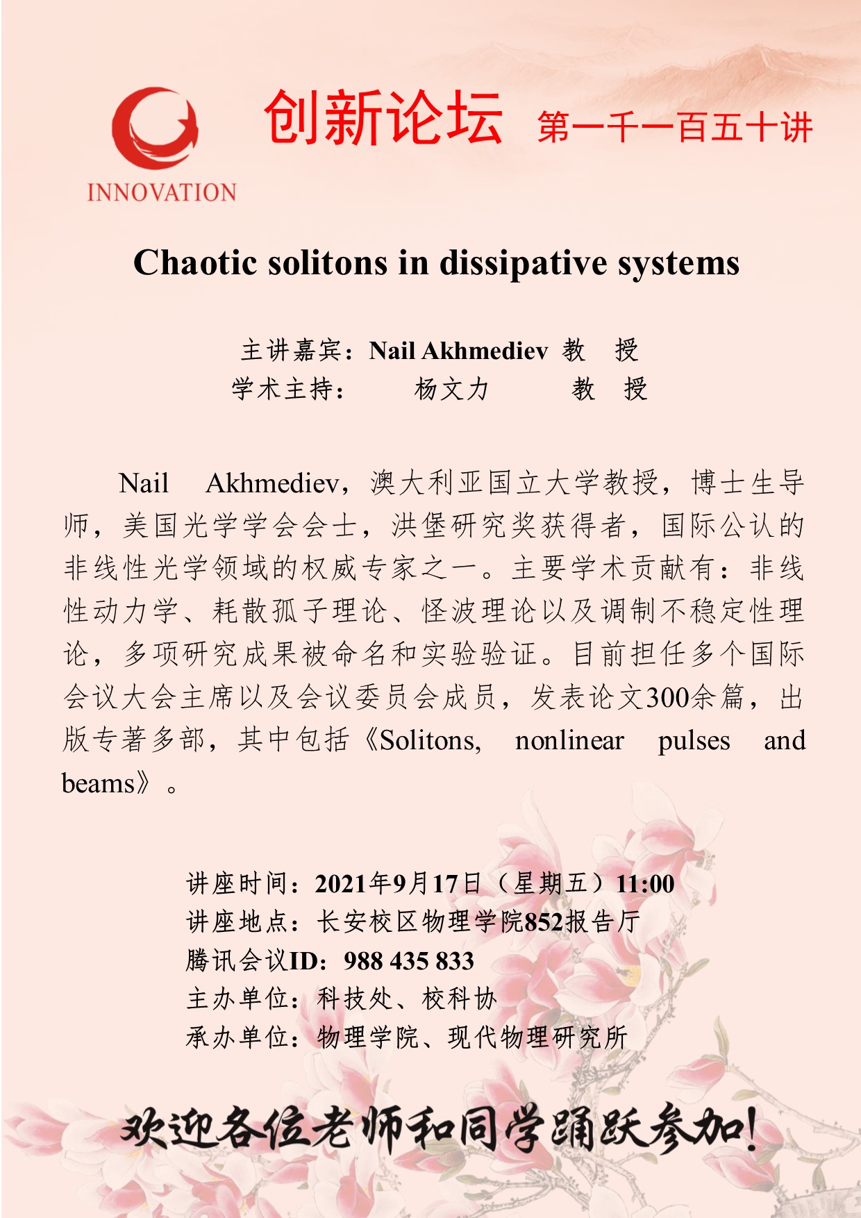 Nail Akhmediev 教授 乐动网页版登录入口创新论坛第一千一百五十讲:Chaotic solitons in dissipative systems 讲座时间 2021年9月17日(星期五)11:00 讲座地点 长安校区物理学院852报告厅 讲座人介绍 Nail Akhmediev 教授 讲座内容