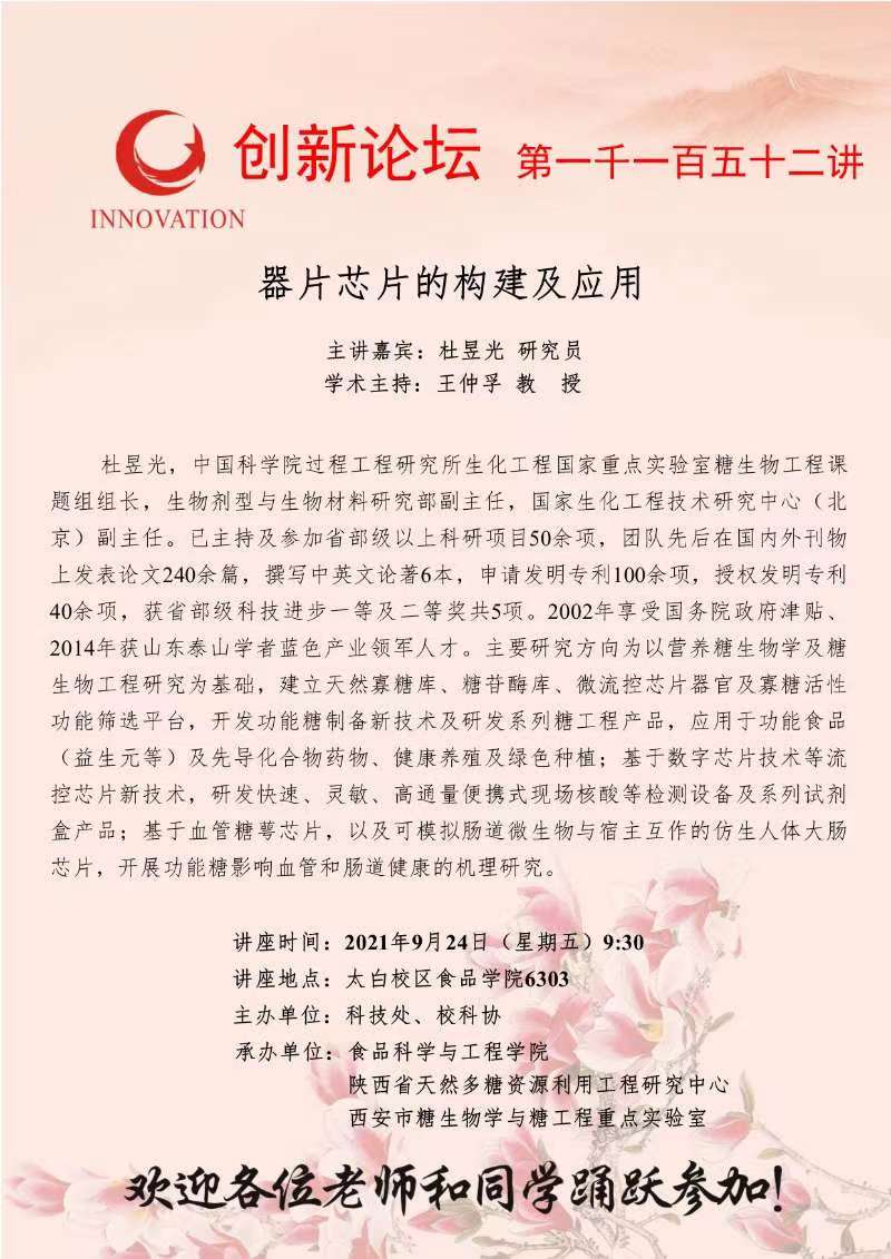 杜昱光 研究员 乐动网页版登录入口创新论坛第一千一百五十二讲:器片芯片的构建及应用 讲座时间 2021年9月24日(星期五)9:30 讲座地点 太白校区食品学院6303 讲座人介绍 杜昱光 研究员 讲座内容