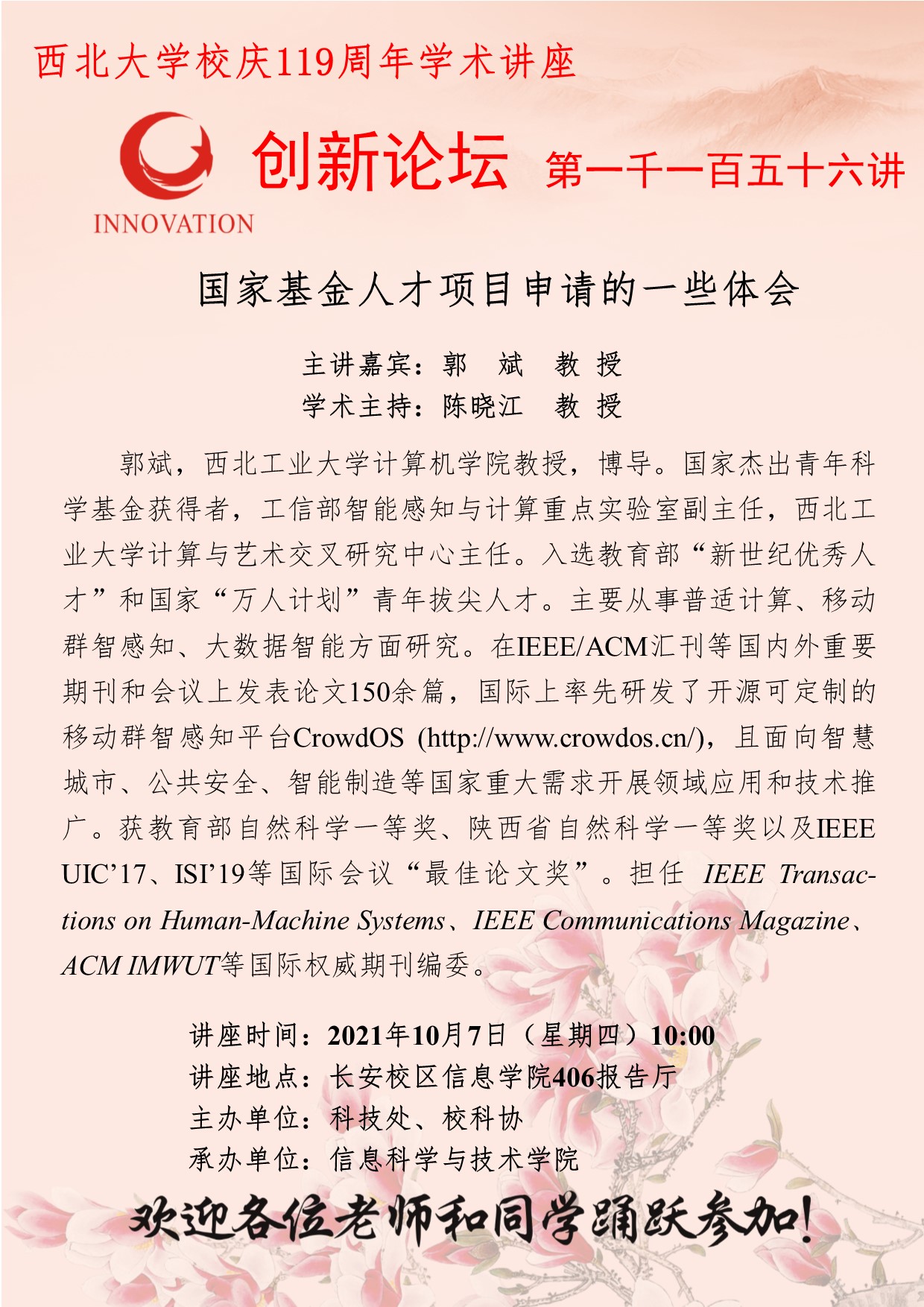 郭斌 教授 乐动网页版登录入口创新论坛第一千一百五十六讲暨校庆119周年学术讲座: 国家基金人才项目申请的一些体会 讲座时间 2021年10月7日(星期四)10:00 讲座地点 长安校区信息学院406报告厅 讲座人介绍 郭斌 教授 讲座内容