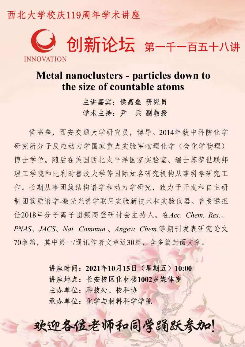 侯高垒 研究员 乐动网页版登录入口创新论坛第一千一百五十八讲暨校庆119周年学术讲座: Metal nanoclusters - particles down to the size of countable atoms 讲座时间 2021年10月15日(星期五)10:00 讲座地点 长安校区化材楼1002多媒体室 讲座人介绍 侯高垒 研究员 讲座内容