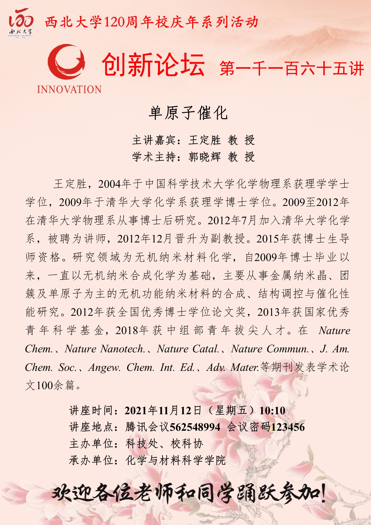 王定胜 教授 乐动网页版登录入口创新论坛第一千一百六十五讲暨120周年校庆年系列活动:单原子催化 讲座时间 2021年11月12日(星期五)10:10 讲座地点 腾讯会议562548994 会议密码123456 讲座人介绍 王定胜 教授 讲座内容