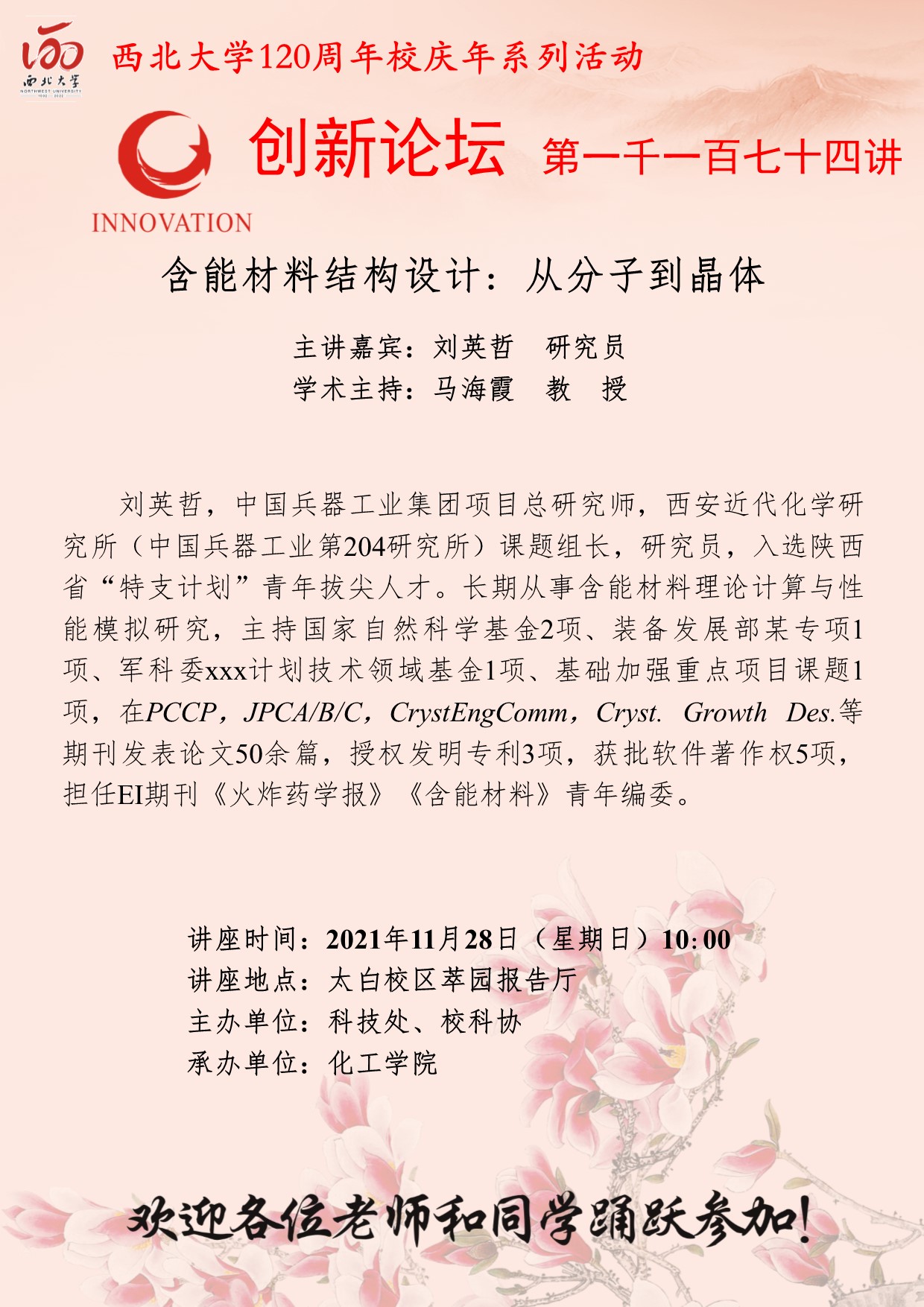刘英哲 研究员 乐动网页版登录入口创新论坛第一千一百七十四讲暨120周年校庆年系列活动:含能材料结构设计: 从分子到晶体 讲座时间 2021年11月28日(星期日)10:00 讲座地点 太白校区萃园报告厅 讲座人介绍 刘英哲 研究员 讲座内容